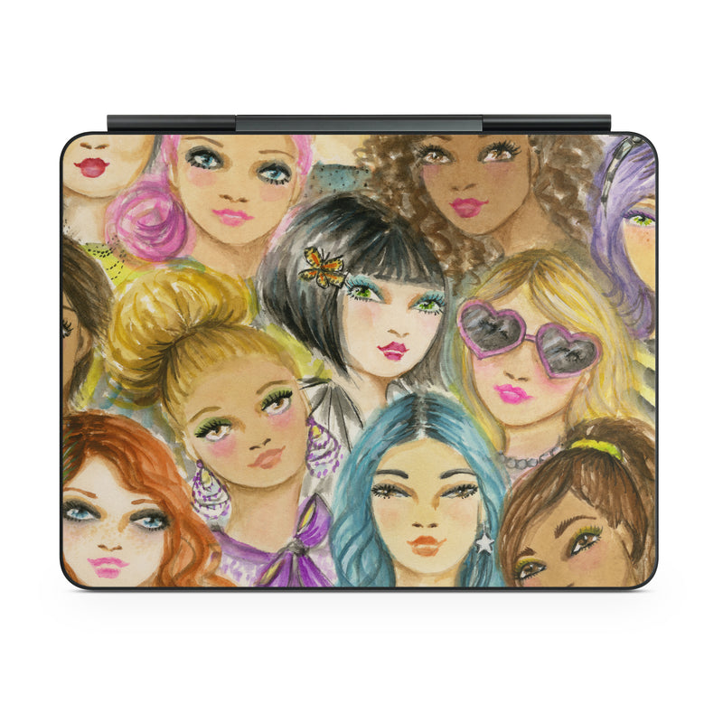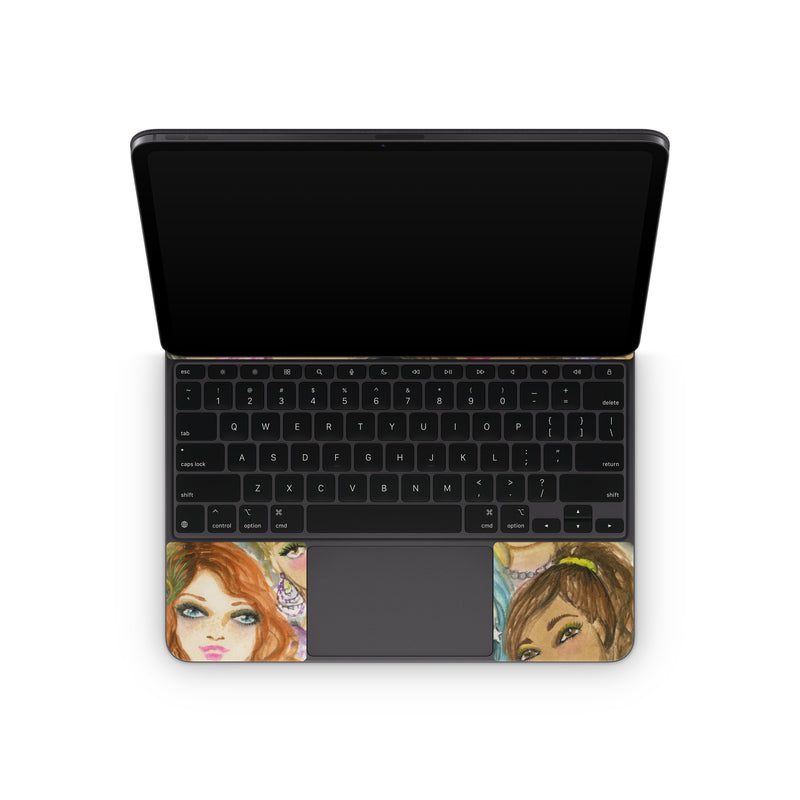 iStyles Magic Keyboard for iPad Series Skin design of Face, Hair, Head, Art, Hair coloring, Cheek, Illustration, Human, Watercolor paint, Brown hair, with white, black, brown, yellow, purple, blue, pink colors, and tagged with people, fineart, flowers, drawn, face, faces, fashion, handdrawn, painting, portrait, woman, women, sunglasses, chinese, caucasian, black, eurasian, asian, european, african.