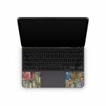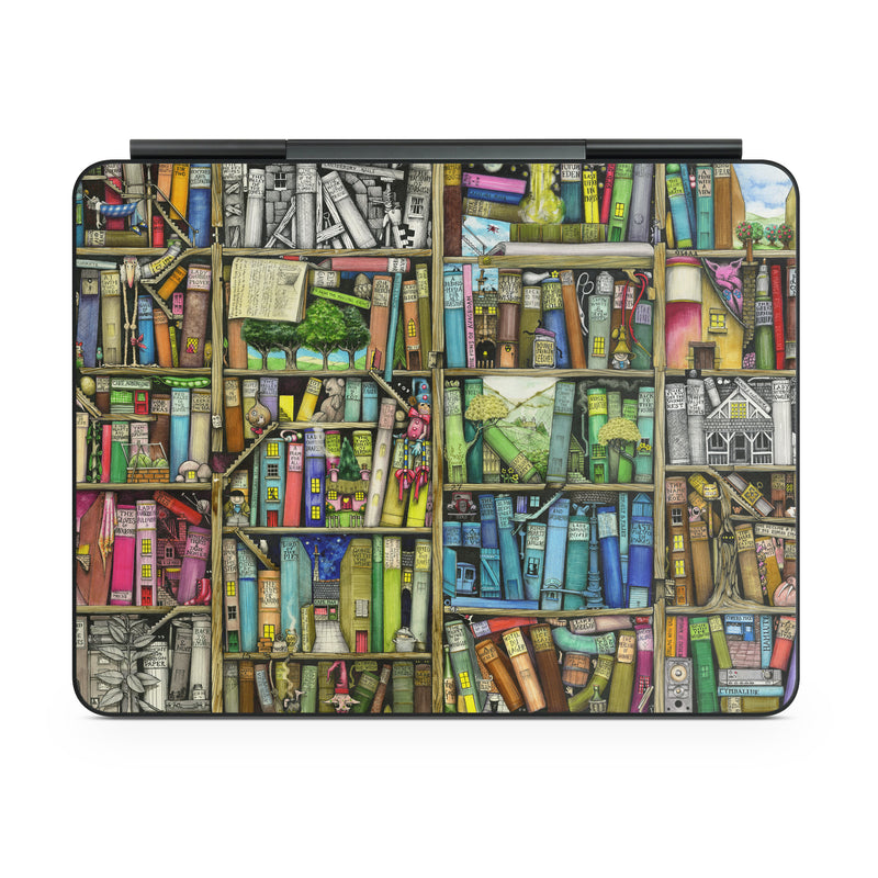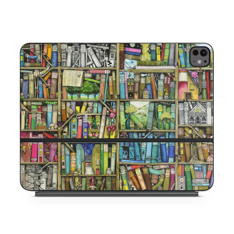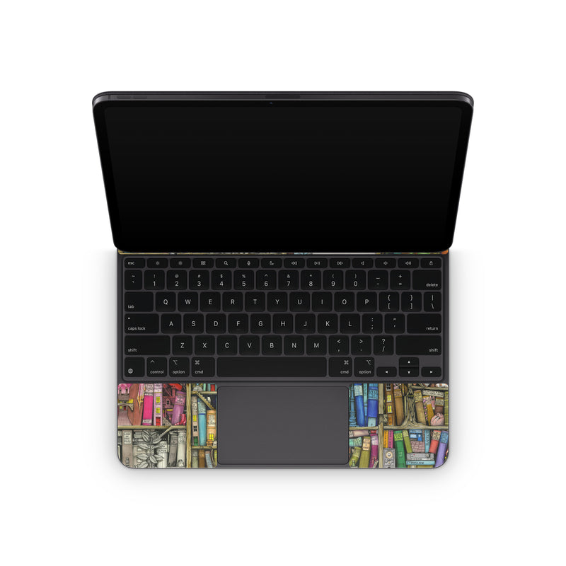 iStyles Magic Keyboard for iPad Series Skin design of Collection, Art, Visual arts, Bookselling, Shelving, Painting, Building, Shelf, Publication, Modern art, with brown, green, blue, red, pink colors, and tagged with patterns, objects, animals.