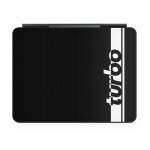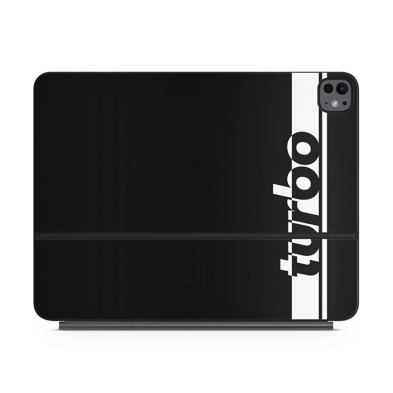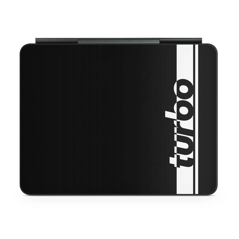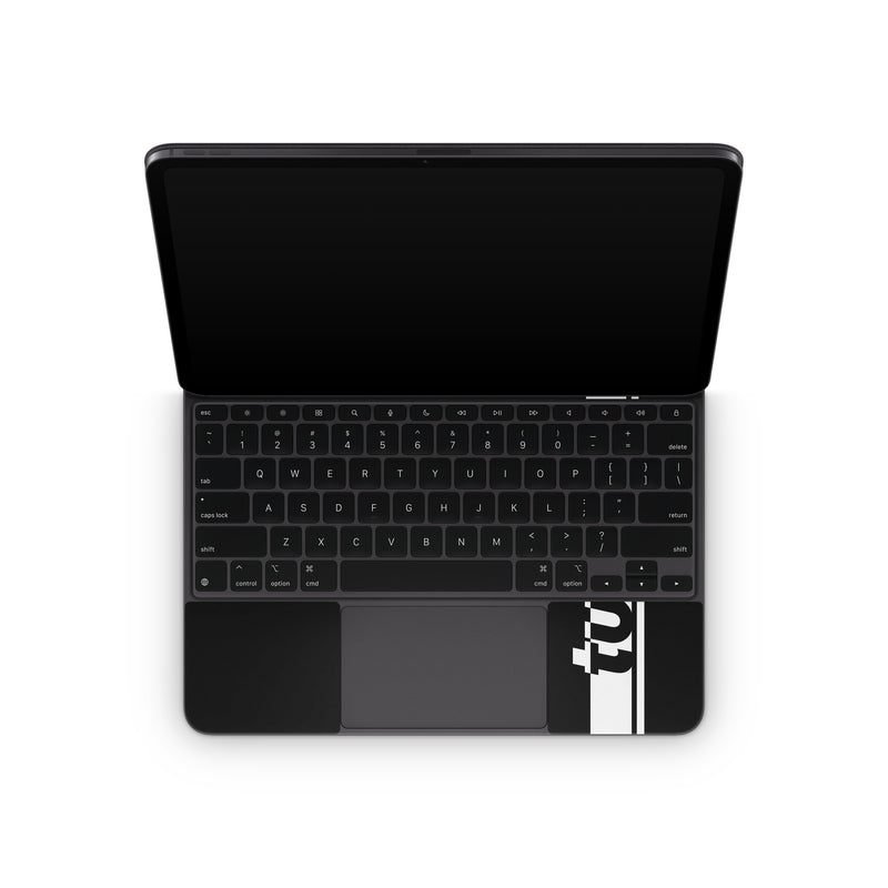 iStyles Magic Keyboard for iPad Series Skin design of Font, Tints and shades, Rectangle, Electric blue, Logo, Brand, Graphics, Pattern, Darkness, Monochrome photography, with black, white colors, and tagged with signs, lookslike, turbo, racecar.