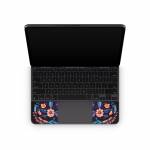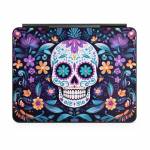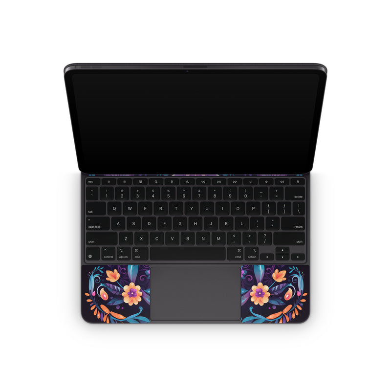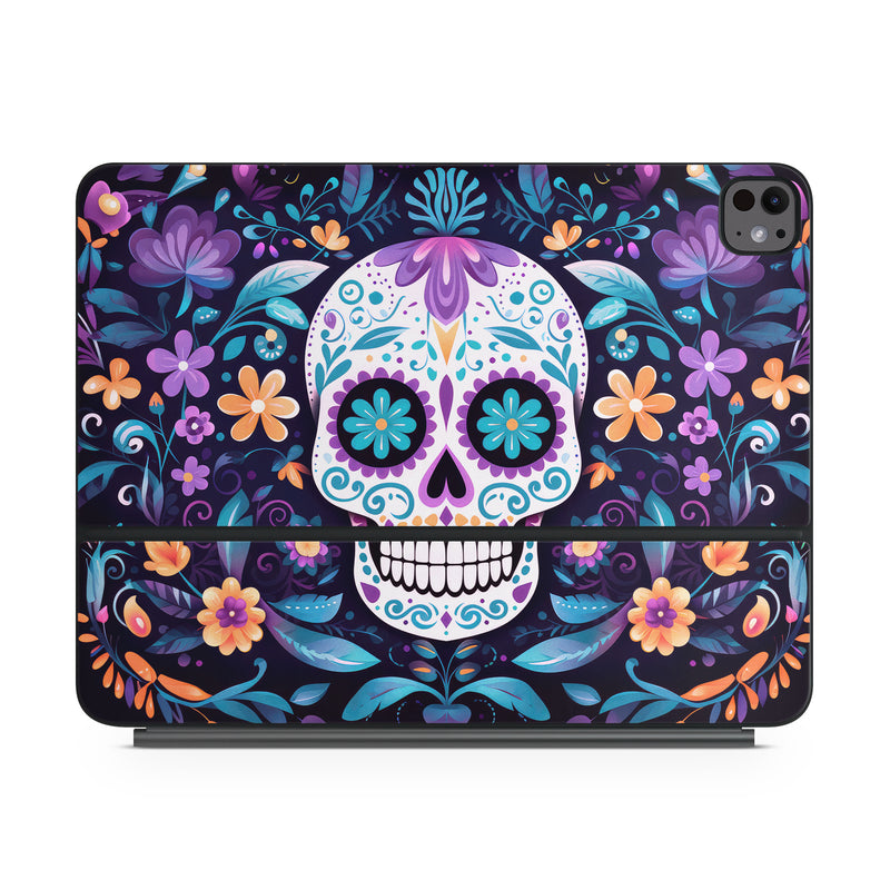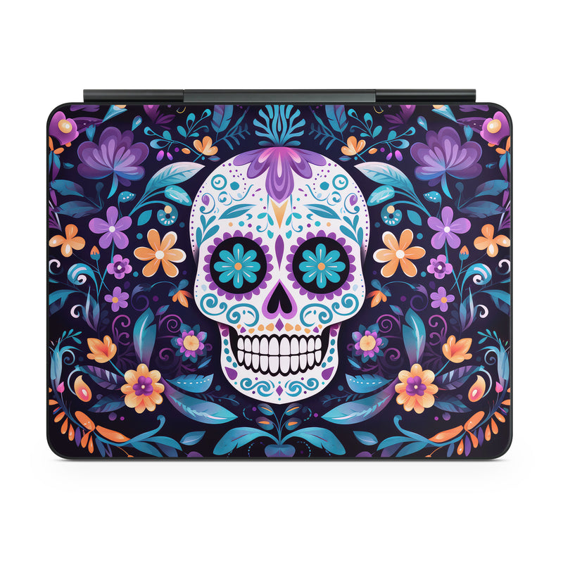 iStyles Magic Keyboard for iPad Series Skin design of Textile, Petal, Aqua, Art, Symmetry, Flower, Pattern, Circle, Magenta, Electric blue, with yellow, orange, red, black, white, blue, purple colors, and tagged with skulls, flowers, halloween, flowers, skull, leaves.