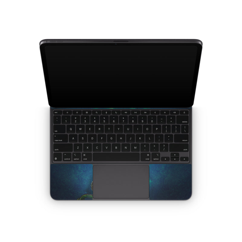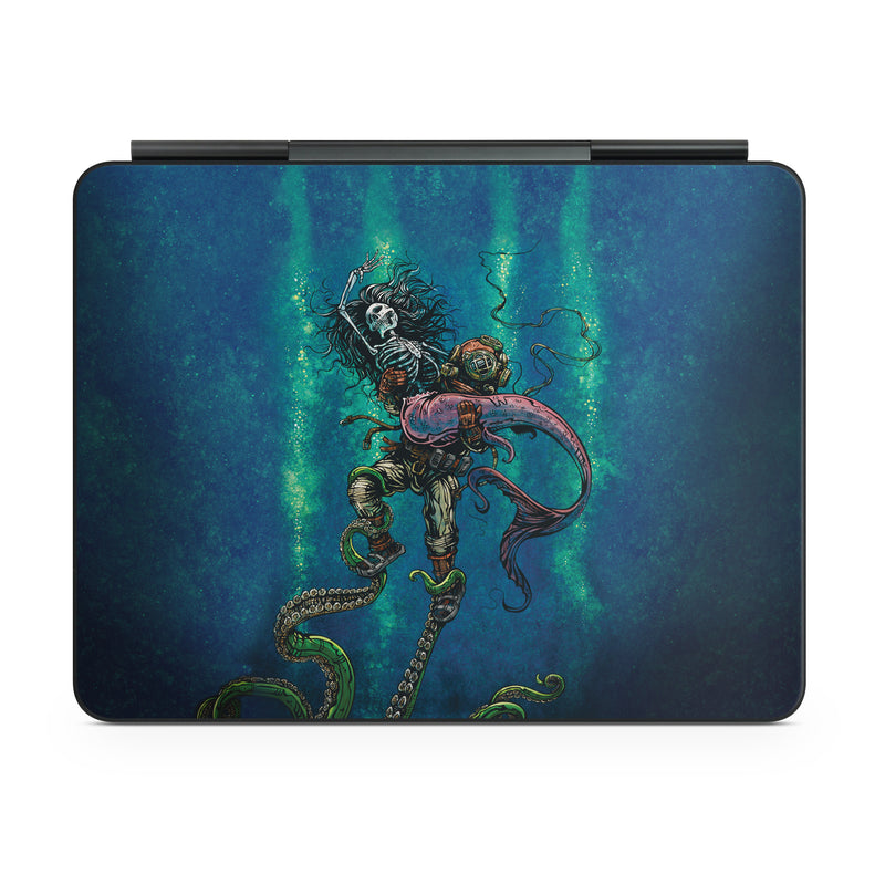 iStyles Magic Keyboard for iPad Series Skin design of Water, Fluid, Underwater, Marine invertebrates, Marine biology, Electric blue, Liquid, Recreation, Underwater diving, Art, with blue, green, orange, purple, pink, black, white, gray colors, and tagged with skulls, animals, fish, octopus.