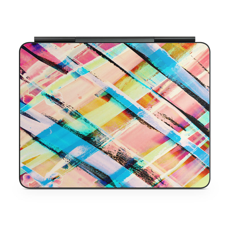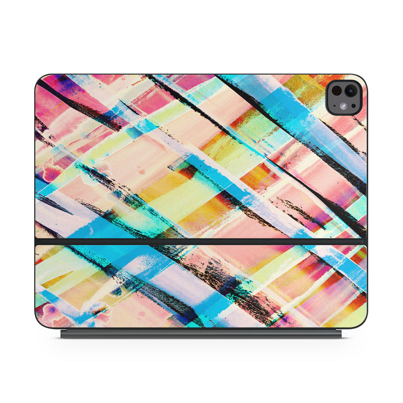 iStyles Magic Keyboard for iPad Series Skin design of Line, Pattern, Turquoise, Plaid, Orange, Colorfulness, Design, Textile, Tints and shades, with blue, pink, red, purple, yellow, orange colors, and tagged with patterns, abstract, bright, pastel, stripes, watercolor.