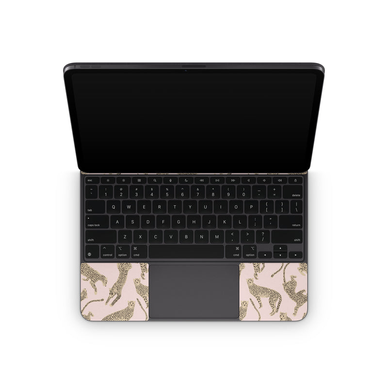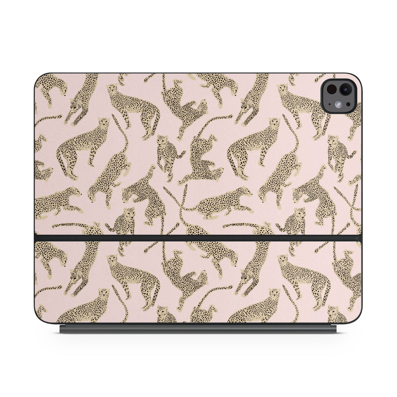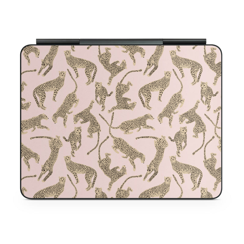 iStyles Magic Keyboard for iPad Series Skin design of Hair, Vertebrate, White, Organ, Textile, Organism, Mammal, Felidae, Font, Line, with pink, yellow, black colors, and tagged with patterns, animals, cheetah, acinonyx, jubatus.