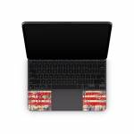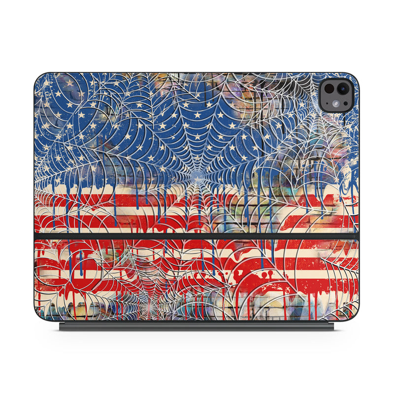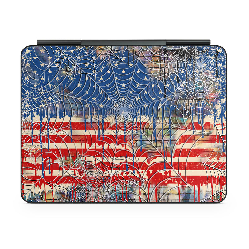 iStyles Magic Keyboard for iPad Series Skin design of Graffiti, Art, Pattern, Flag, Street art, Line, Textile, Mural, Modern art, with red, blue, white, black colors, and tagged with patterns, flags, animals, bricks, cobweb, flag, spider, usa, web.