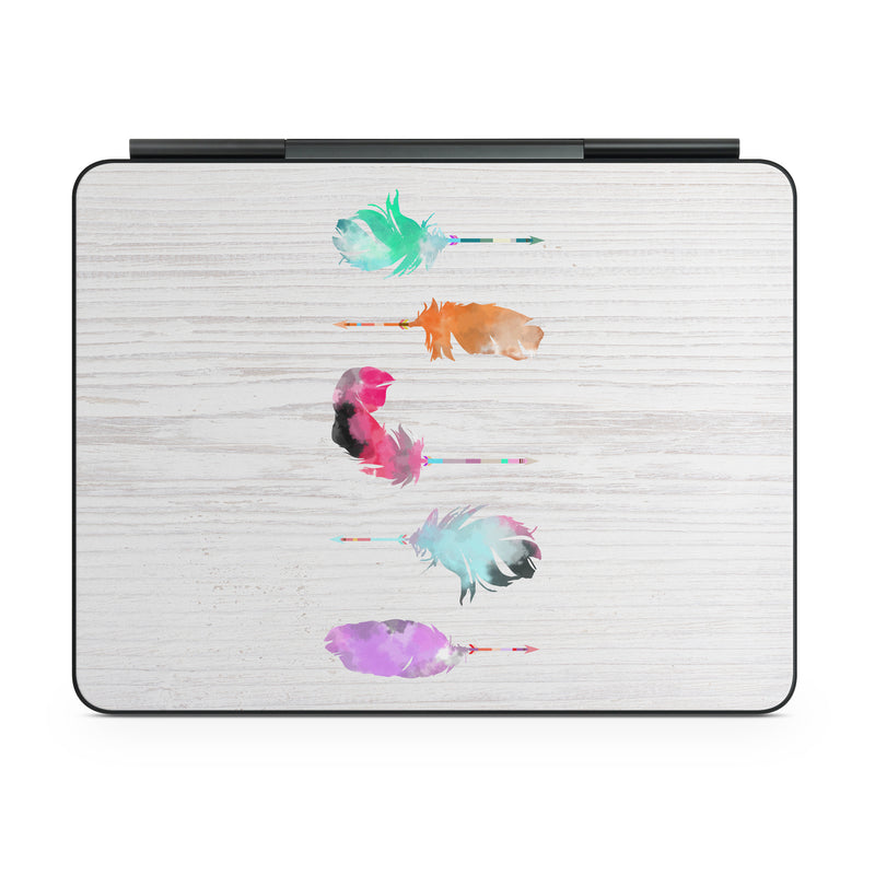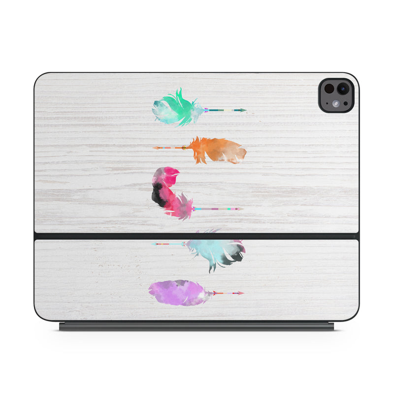 iStyles Magic Keyboard for iPad Series Skin design of Pink, Watercolor paint, Illustration, Feather, Design, Art, Painting, Graphic design, Visual arts, Drawing, with white, orange, red, blue, pink, purple, green colors, and tagged with patterns, objects.