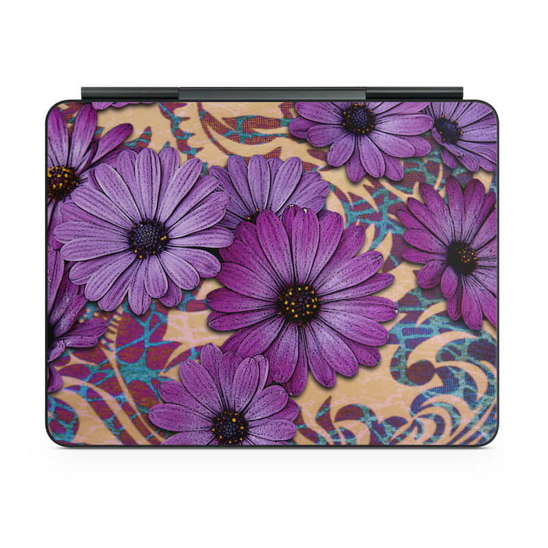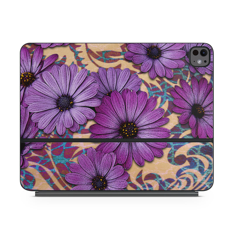 iStyles Magic Keyboard for iPad Series Skin design of Purple, Flower, Violet, Petal, Plant, african daisy, Floral design, Wildflower, Pattern, Textile, with purple, black, gray, blue, green, red colors, and tagged with flowers, patterns.