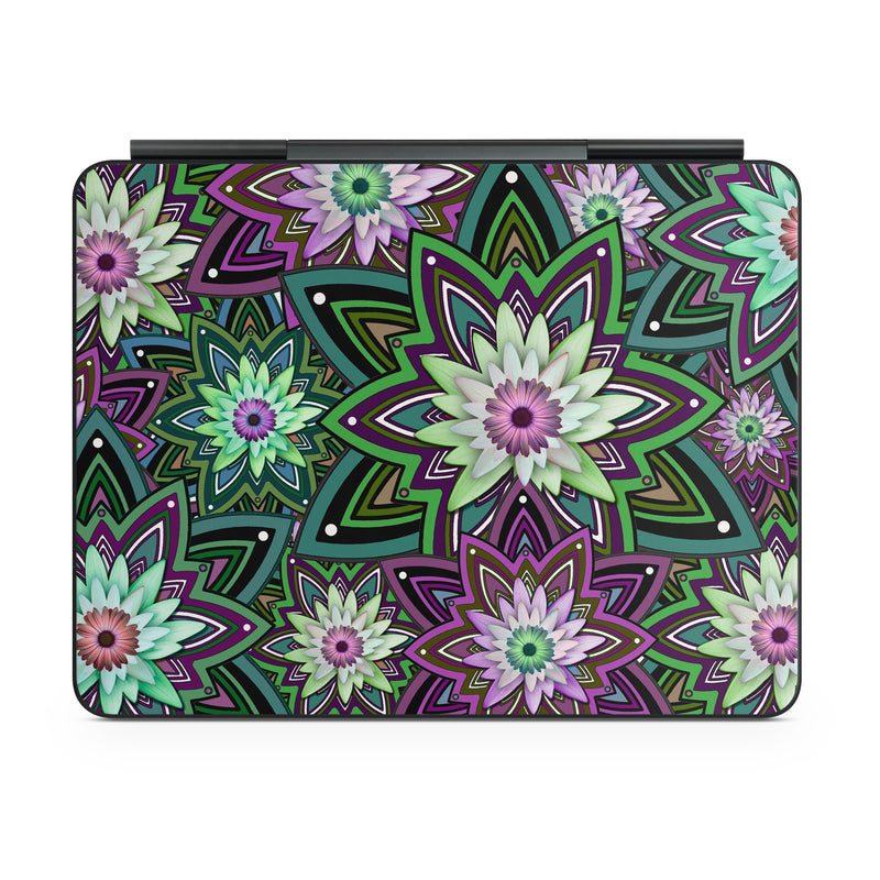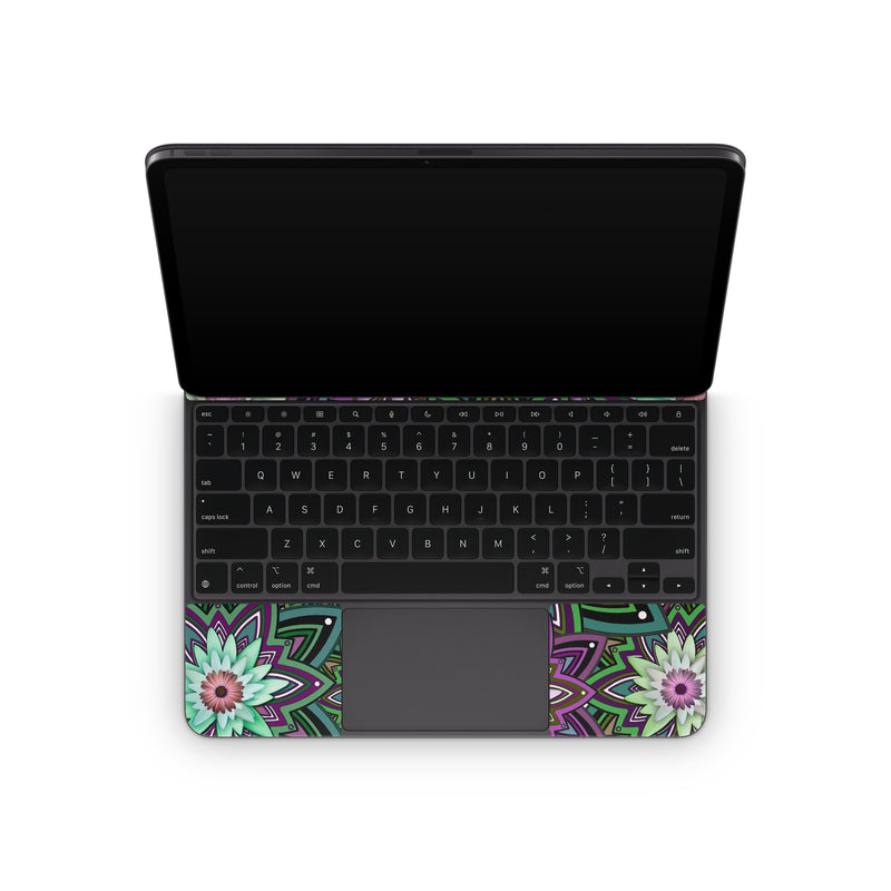 iStyles Magic Keyboard for iPad Series Skin design of Pattern, Purple, Green, Flower, Psychedelic art, Design, Lilac, Plant, Symmetry, Visual arts, with black, gray, green, purple, blue, red colors, and tagged with patterns, flowers.
