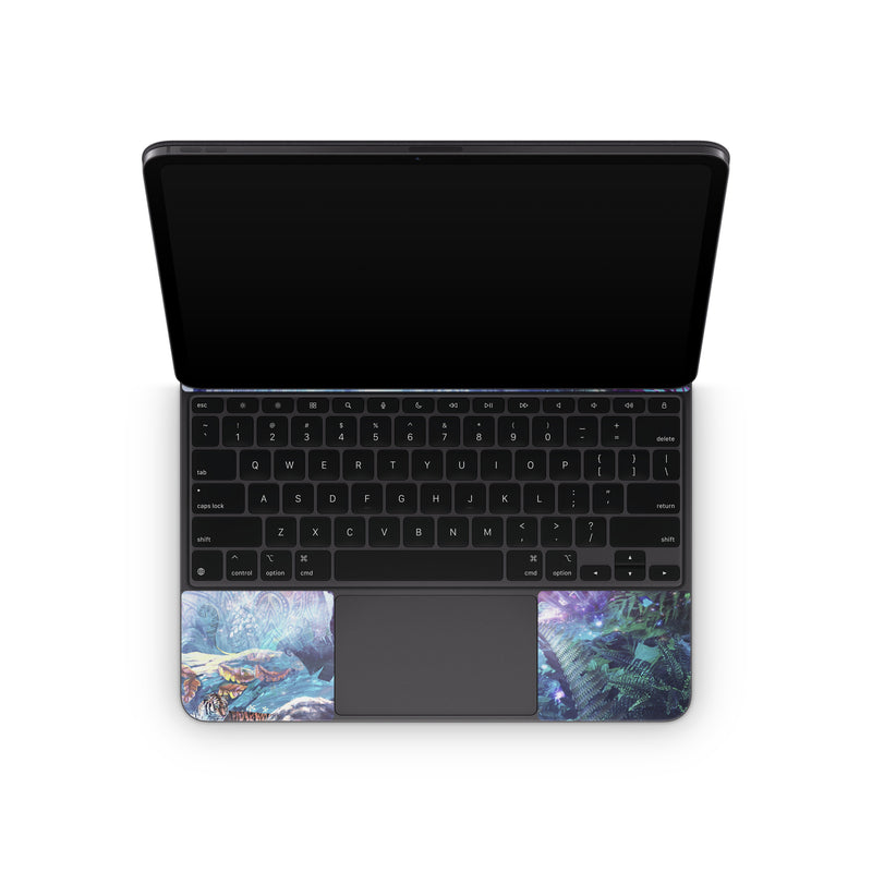 iStyles Magic Keyboard for iPad Series Skin design of Man, Woman, Fictional Character, Mythology, Bird, Wing, Mythical Creature, Deer, Tiger, Mushrooms, Butterfly, with white, blue, green, red, yellow, black, purple, gray colors, and tagged with space, fantasy, animals, nature, urban, people, objects, flowers, dance, dancing, dream, dreaming, fantasy, forest, love, nature, woods.