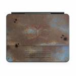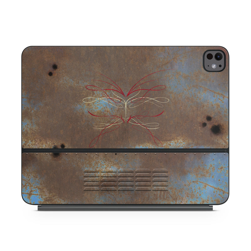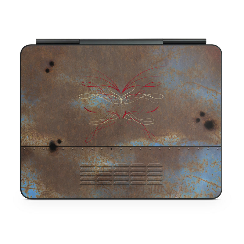 iStyles Magic Keyboard for iPad Series Skin design of Line, Visual arts, Symmetry, Concrete, Tints and shades, Painting, Art, with blue, red, yellow, brown, black colors, and tagged with signs, lookslike, objects, patterns, hotrod, musclecar, ratrod, retro, rust.