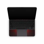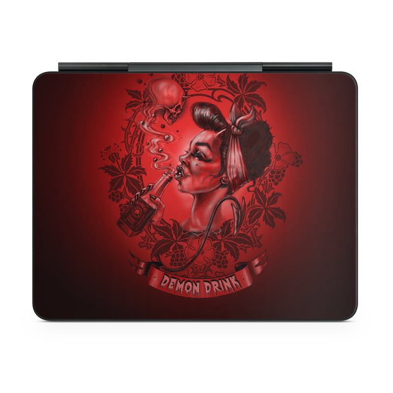 iStyles Magic Keyboard for iPad Series Skin design of Font, Art, Magenta, Pattern, Graphics, Visual arts, Painting, Carmine, Illustration, Drawing, with black, red, white colors, and tagged with skulls, signs, people, objects, fantasy, addiction, alcohol, bottle.