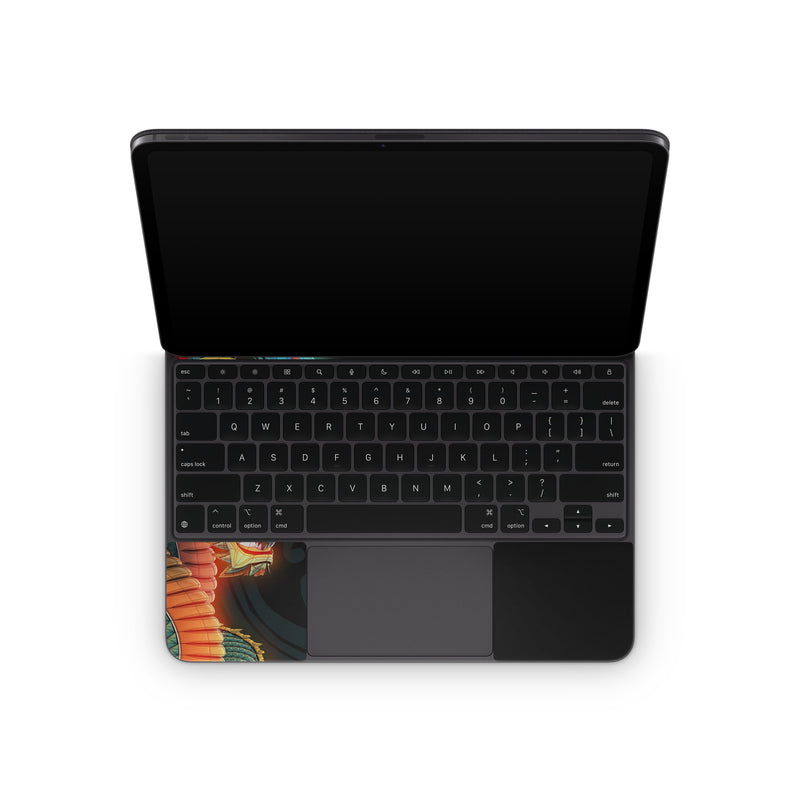 iStyles Magic Keyboard for iPad Series Skin design of Dragon, Fictional character, Illustration, Art, Cg artwork, Fiction, Mythical creature, Graphics, with black, green, red, yellow, orange colors, and tagged with animals, fantasy, blue, dragons, green, orange, tattoo.