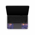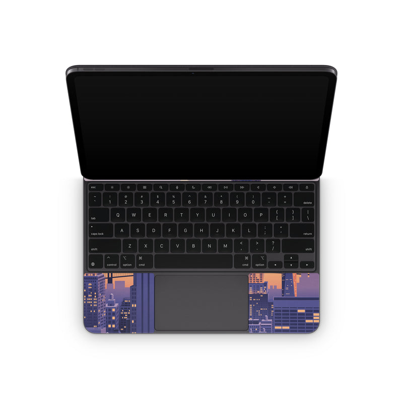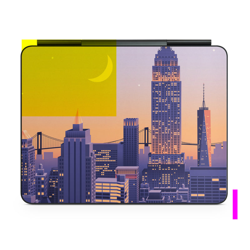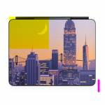 iStyles Magic Keyboard for iPad Series Skin design of Skyscraper, Building, Sky, Atmosphere, Moon, World, Nature, Tower, Afterglow, Dusk, with blue, purple, yellow, orange colors, and tagged with urban, space, empire, state, building, new, york, skyline, brooklyn, bridge, moon, stars.