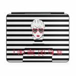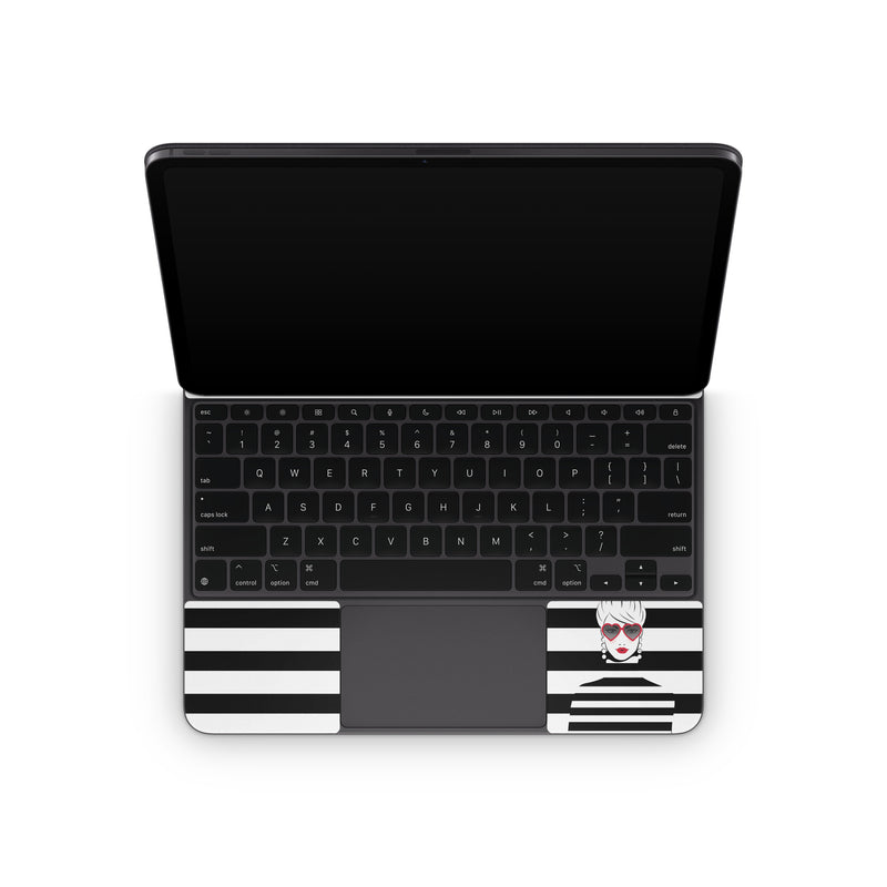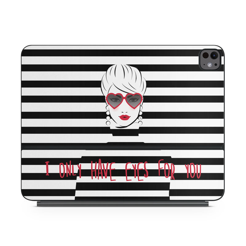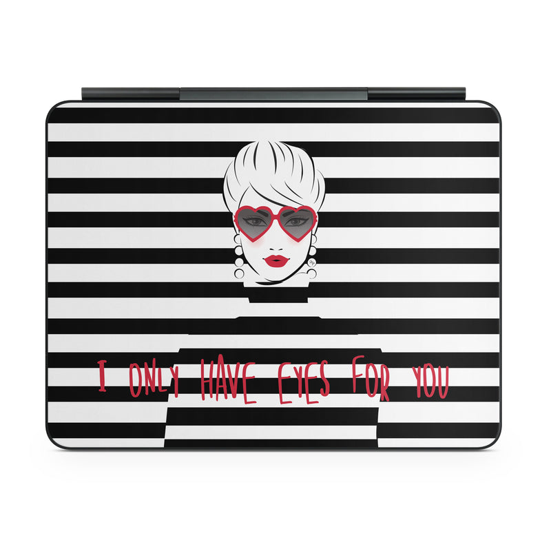 iStyles Magic Keyboard for iPad Series Skin design of Rectangle, Font, Gesture, Eyewear, Art, Technology, Personal protective equipment, Goggles, Logo, Eyelash, with black, white, yellow, red colors, and tagged with signs, objects, people, patterns, blackandwhite, girl, glasses, red, stripes, only, have, eyes, for, you.