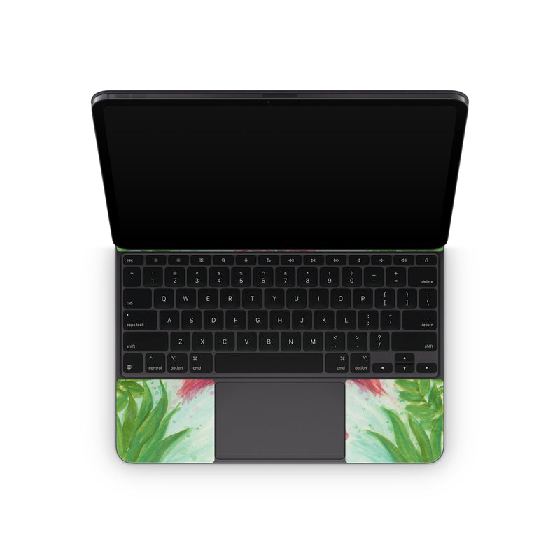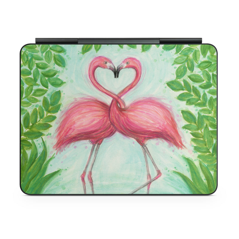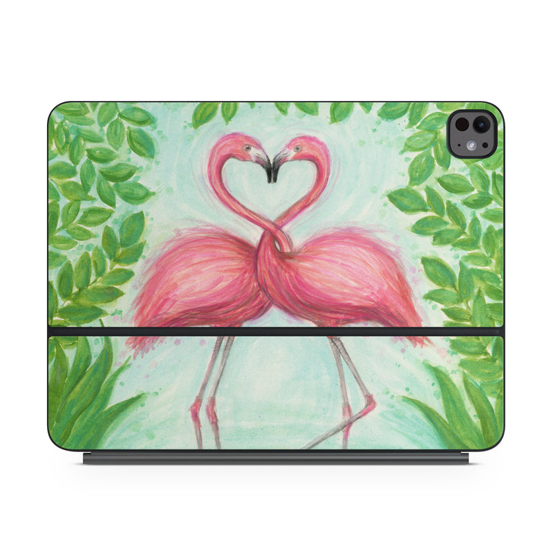 iStyles Magic Keyboard for iPad Series Skin design of Flamingo, Greater flamingo, Bird, Water bird, Pink, Illustration, Watercolor paint, Organism, Drawing, Stork, with pink, blue, green colors, and tagged with fineart, animals, hearts, nature, animals, birds, flamingo, tropical, tropics.