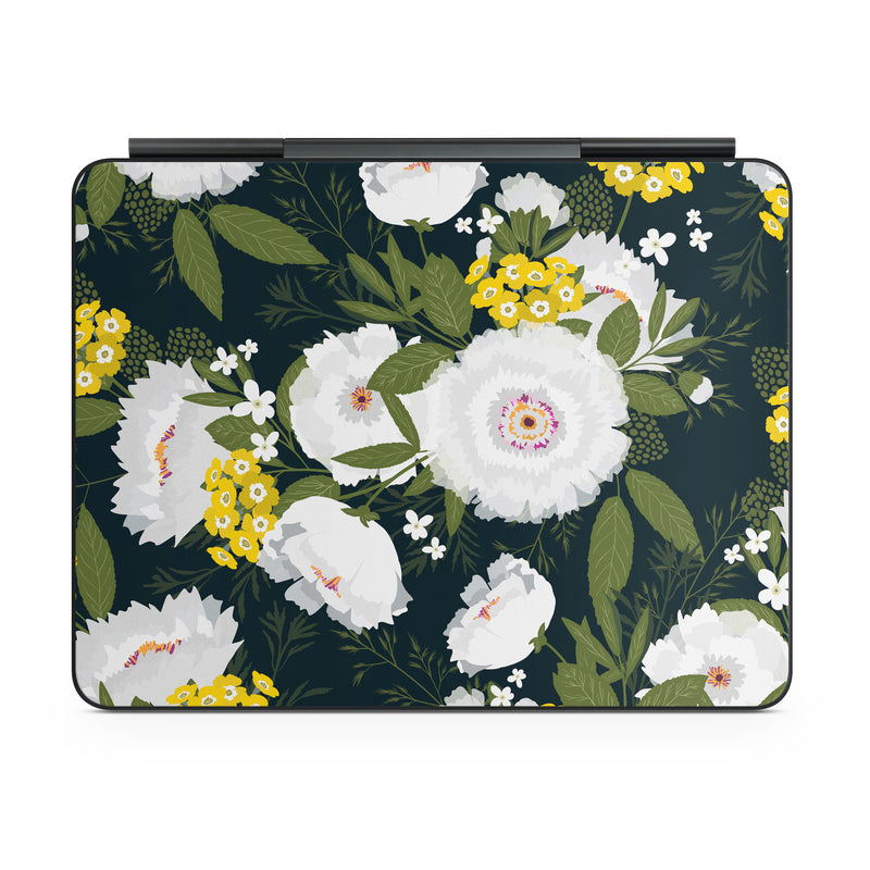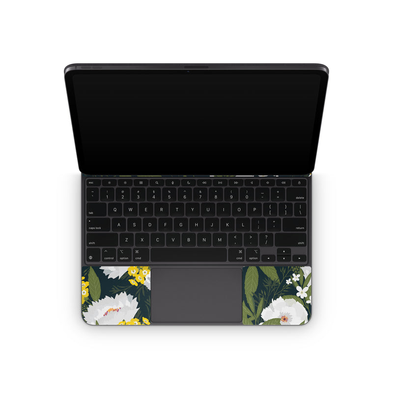 iStyles Magic Keyboard for iPad Series Skin design of Flower, Flowering plant, Plant, Petal, Daisy, mayweed, Wildflower, Floral design, Annual plant, with green, yellow, white, orange colors, and tagged with patterns, flowers, filigree, floral, flower, flowers, pattern.