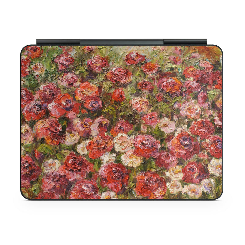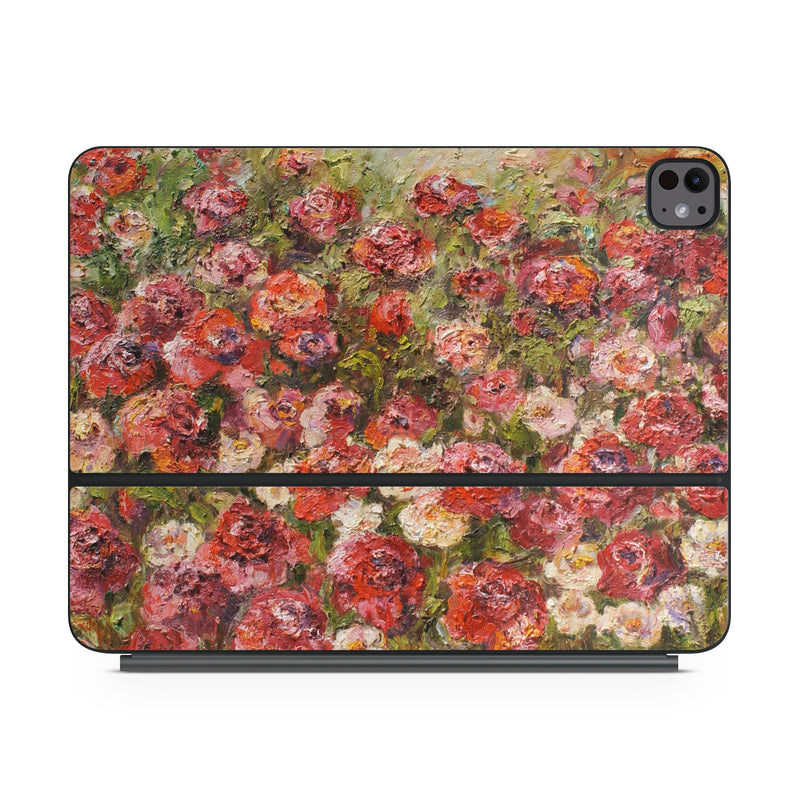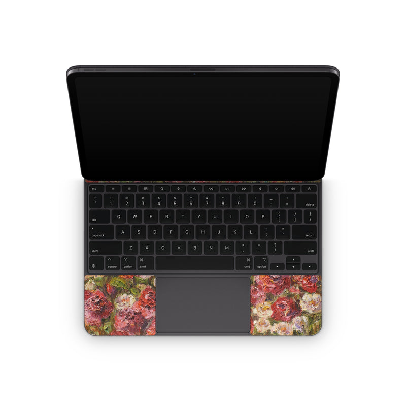 iStyles Magic Keyboard for iPad Series Skin design of Flower, Garden roses, Rose, Plant, Floribunda, Flowering plant, Rosa × centifolia, Rose family, Botany, Petal, with red, black, green, gray colors, and tagged with flowers, fineart.