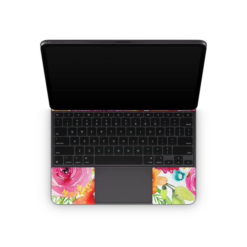 iStyles Magic Keyboard for iPad Series Skin design of Flower, Cut flowers, Floral design, Plant, Pink, Bouquet, Petal, Flower Arranging, Artificial flower, Clip art, with pink, red, green, orange, yellow, blue, white colors, and tagged with flowers, patterns, bloom, blooms, florals, flowers, pink, watercolor.