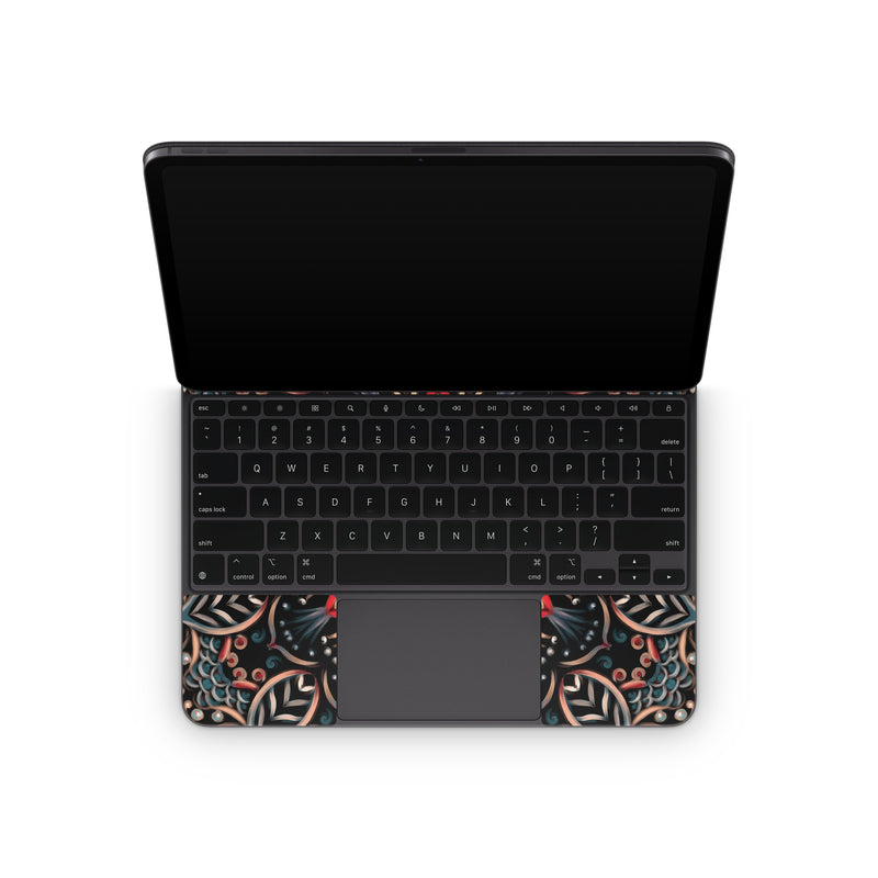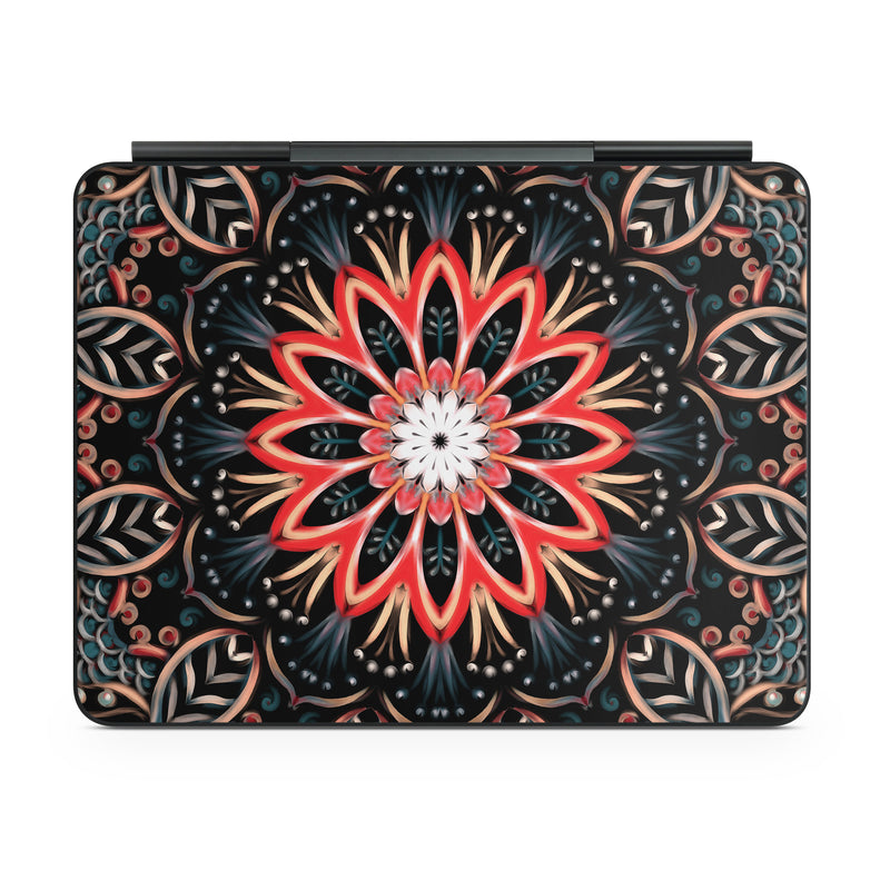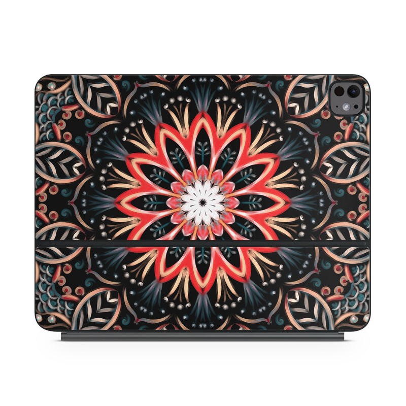 iStyles Magic Keyboard for iPad Series Skin design of Pattern, Psychedelic art, Symmetry, Design, Art, Visual arts, Textile, Kaleidoscope, Fractal art, Ornament, with black, red, white, blue, yellow, orange colors, and tagged with patterns, flowers, abstract, abstract, blue, bright, floral, flower, orange, white.