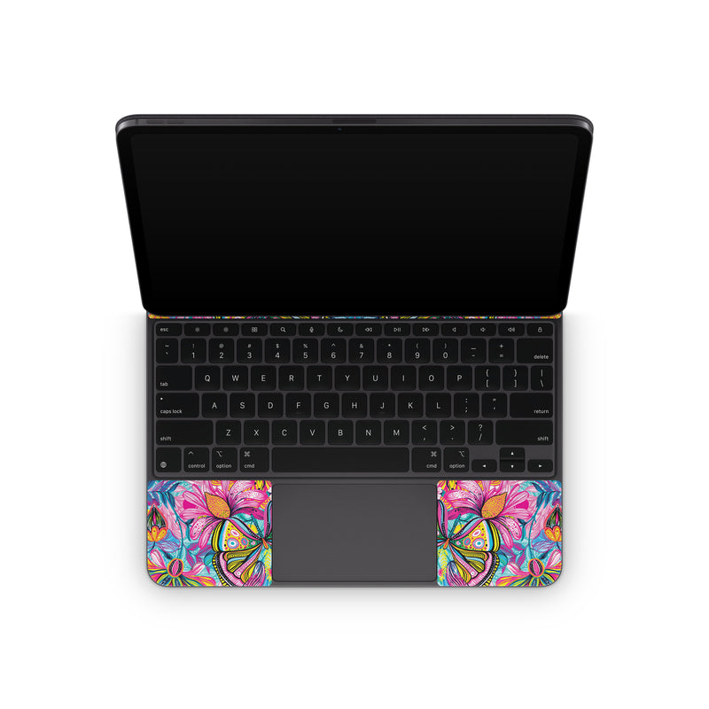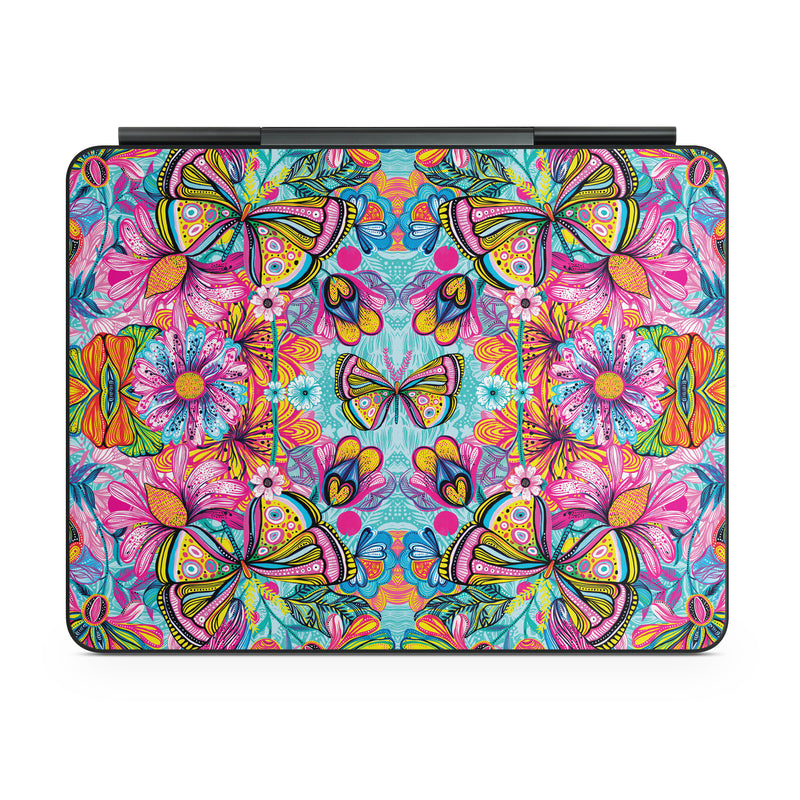 iStyles Magic Keyboard for iPad Series Skin design of Pattern, Design, Textile, Psychedelic art, Visual arts, Symmetry, Art, Motif, with blue, pink, green, yellow, orange, purple colors, and tagged with patterns, flowers, animals, bright, butterfly, carpintos, colorful, flowers, pastels, pattern, spring, summer.