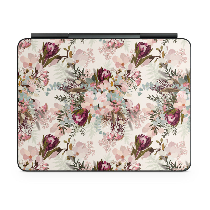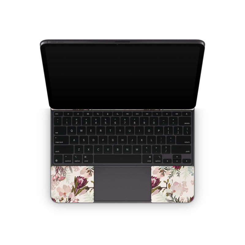 iStyles Magic Keyboard for iPad Series Skin design of Pink, Pattern, Lilac, Flower, Plant, Petal, Floral design, Textile, Design, Blossom, with white, red, pink, blue, brown colors, and tagged with patterns, flowers, nature, bouquet, filigree, floral, flower, flowers, pastel.