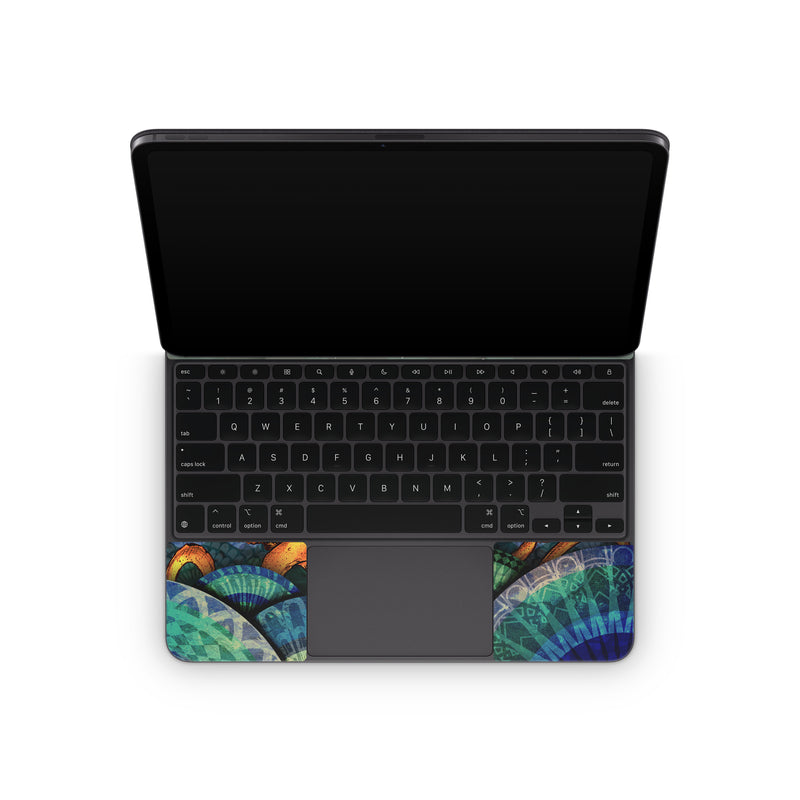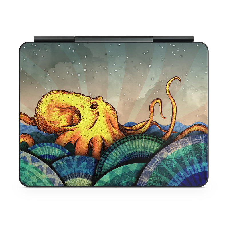 iStyles Magic Keyboard for iPad Series Skin design of Illustration, Fractal art, Art, Cg artwork, Sky, Organism, Psychedelic art, Graphic design, Graphics, Octopus, with black, gray, blue, green, red colors, and tagged with animals, fantasy.