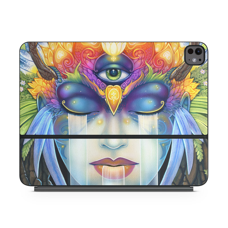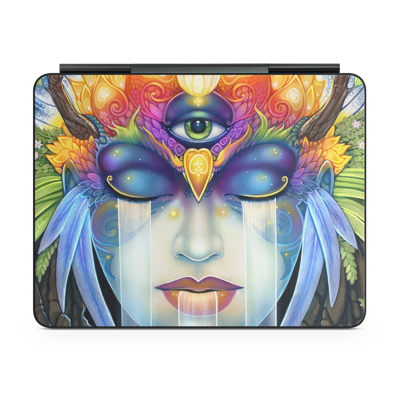 iStyles Magic Keyboard for iPad Series Skin design of Art paint, Paint, Painting, Art, Illustration, Fictional character, Symmetry, Cg artwork, Visual arts, Electric blue, with blue, yellow, orange, red, purple, blue, green, brown, gray colors, and tagged with fantasy, people, nature, flames, earth, terra, primordial, deities, ancestral, mother, uranus, titans, cyclopes, giants, pontus, eye, leaves.