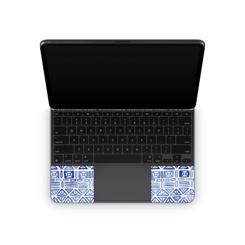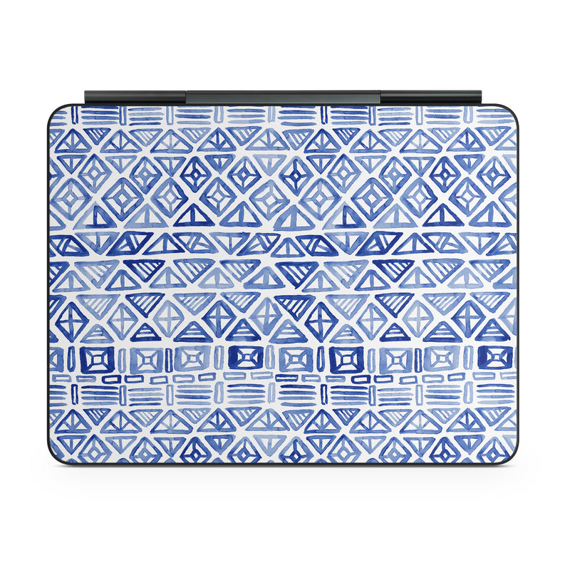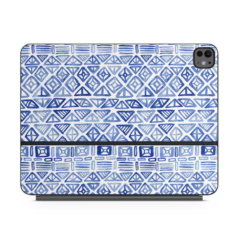 iStyles Magic Keyboard for iPad Series Skin design of Pattern, Line, Design, Symmetry, Visual arts, Parallel, with white, blue colors, and tagged with patterns, blue, geometric, magpiemoon, pattern, tribal, watercolor, white.