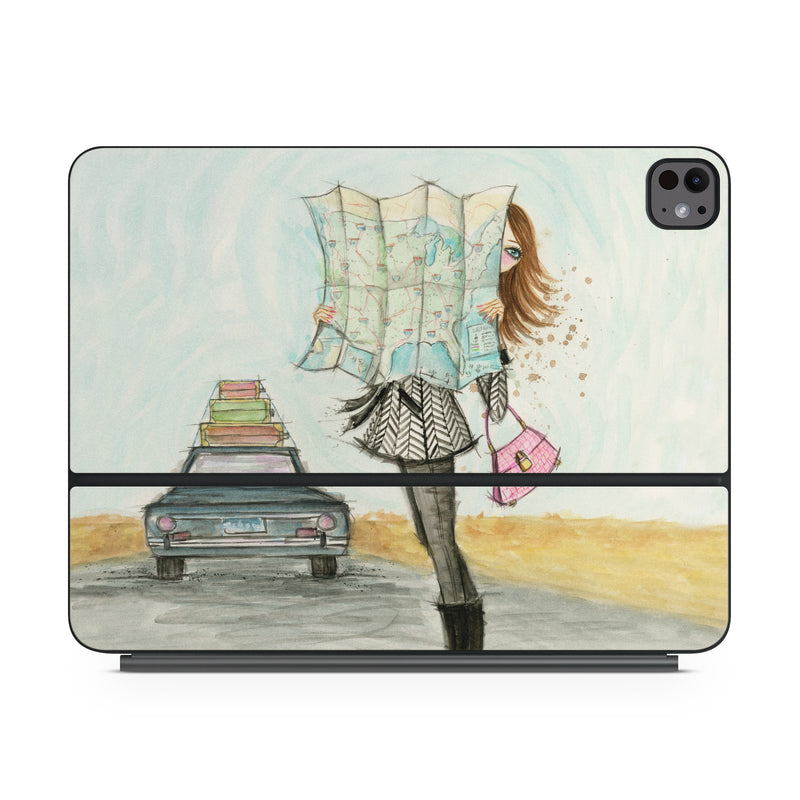 iStyles Magic Keyboard for iPad Series Skin design of Fashion illustration, Sketch, Watercolor paint, Illustration, Drawing, Art, Footwear, Vehicle, Painting, Fashion design, with blue, black, gray, white, pink, brown, green, orange, yellow colors, and tagged with people, fineart, objects, fashion, maps, adventure, driving, fashion, map, roadtrip.