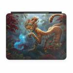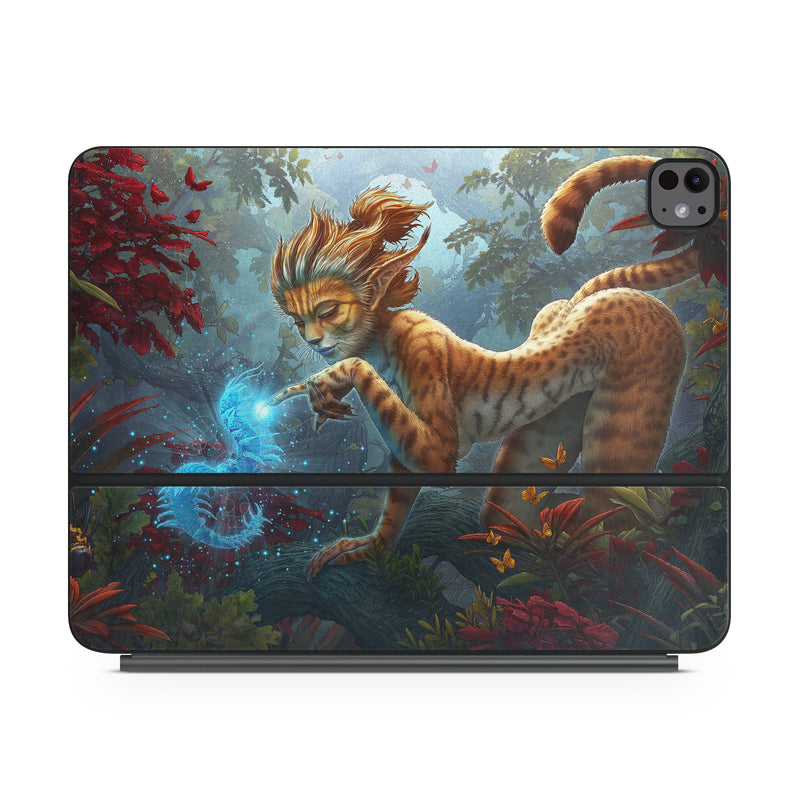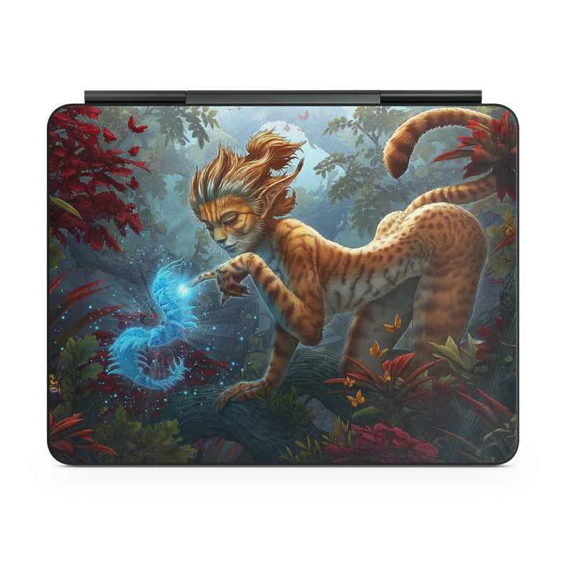 iStyles Magic Keyboard for iPad Series Skin design of Fictional character, Mythology, Illustration, Cg artwork, Sky, Organism, Dragon, Felidae, Mythical creature, Art, with yellow, red, black, green, blue colors, and tagged with fantasy, animals, patterns, people, nature, cat, fantasy, forest, nature, woman.