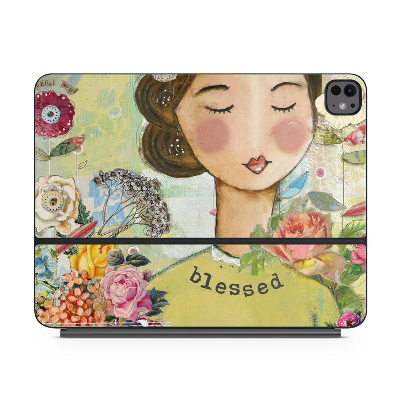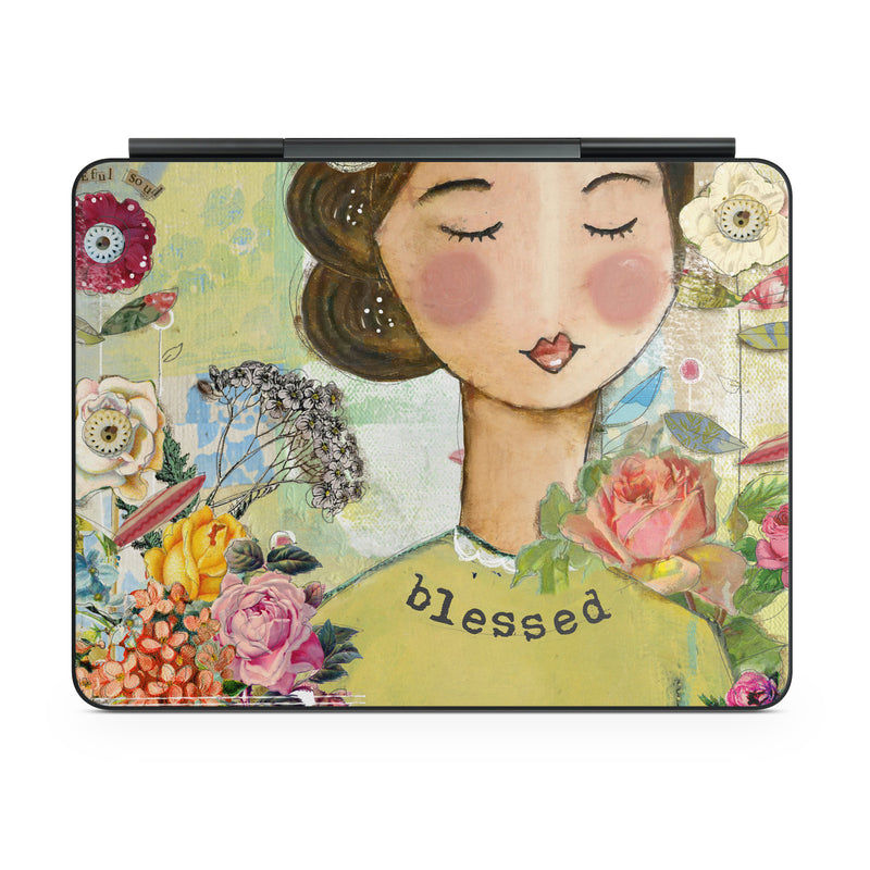 iStyles Magic Keyboard for iPad Series Skin design of Illustration, Cheek, Art, Watercolor paint, Retro style, Painting, Plant, Flower, Fashion illustration, Fictional character, with pink, green, yellow, white, red, blue colors, and tagged with signs, flowers, animals, music, people, blessed, butterflies, flowers, inspire, uplifting.