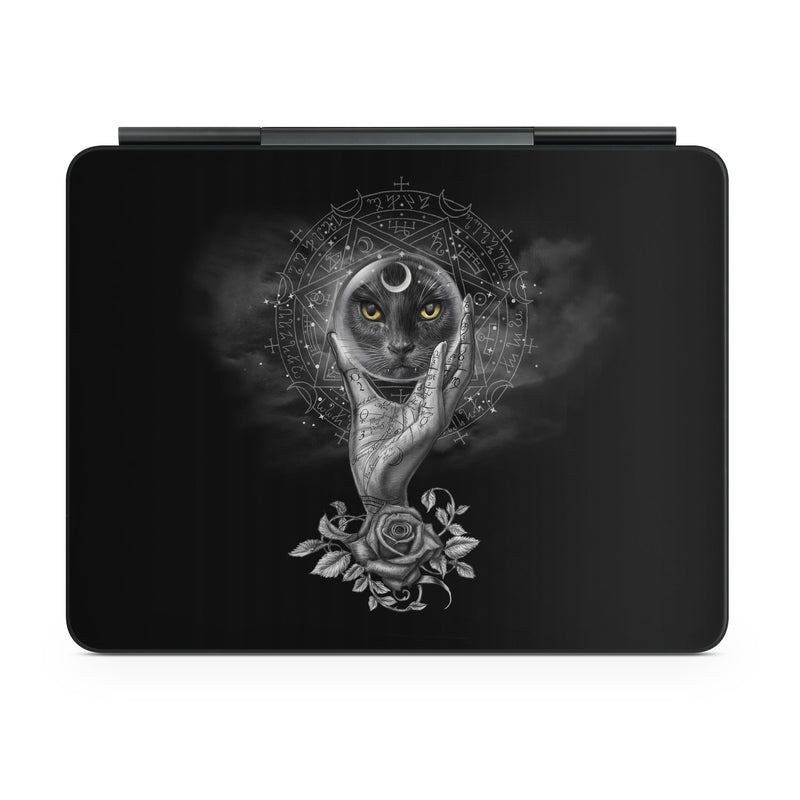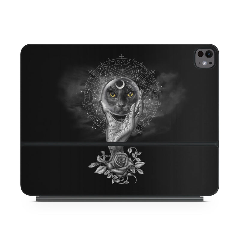 iStyles Magic Keyboard for iPad Series Skin design of Head, Eye, Flash photography, Painting, Headgear, Art, Font, Snout, Darkness, Owl, with black, white, gray colors, and tagged with animals, signs, flowers, people, objects, fantasy, cat, crystal, ball, roses.