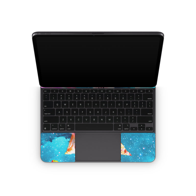 iStyles Magic Keyboard for iPad Series Skin design of Illustration, Organism, Graphic design, Art, Space, Fictional character, Extreme sport, Graphics, with blue, white, gray, yellow, red, orange colors, and tagged with space, animals, fantasy, animals, funny, galaxy, lasers, random, space, weird.