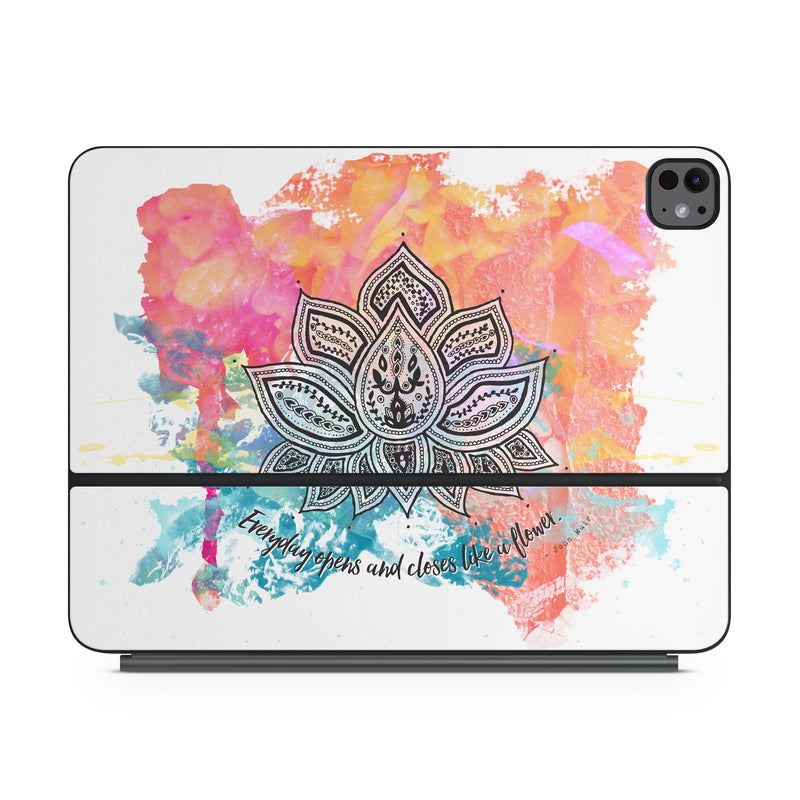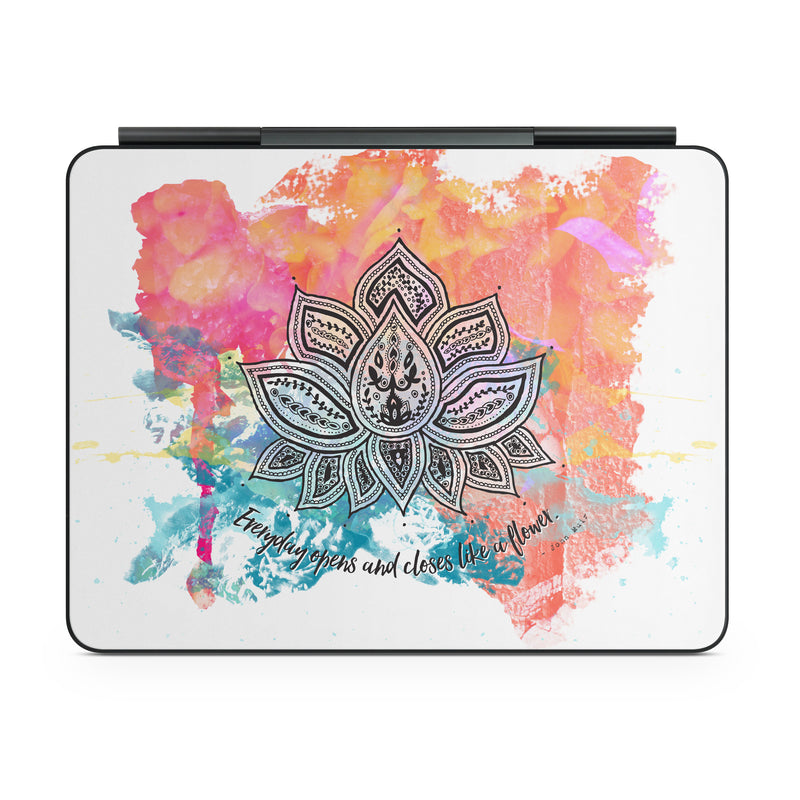 iStyles Magic Keyboard for iPad Series Skin design of Pink, Leaf, Pattern, Design, Graphic design, Illustration, Symmetry, Visual arts, Art, Plant, with orange, yellow, red, blue, green, black colors, and tagged with signs, flowers, colorful, flower, lotus.