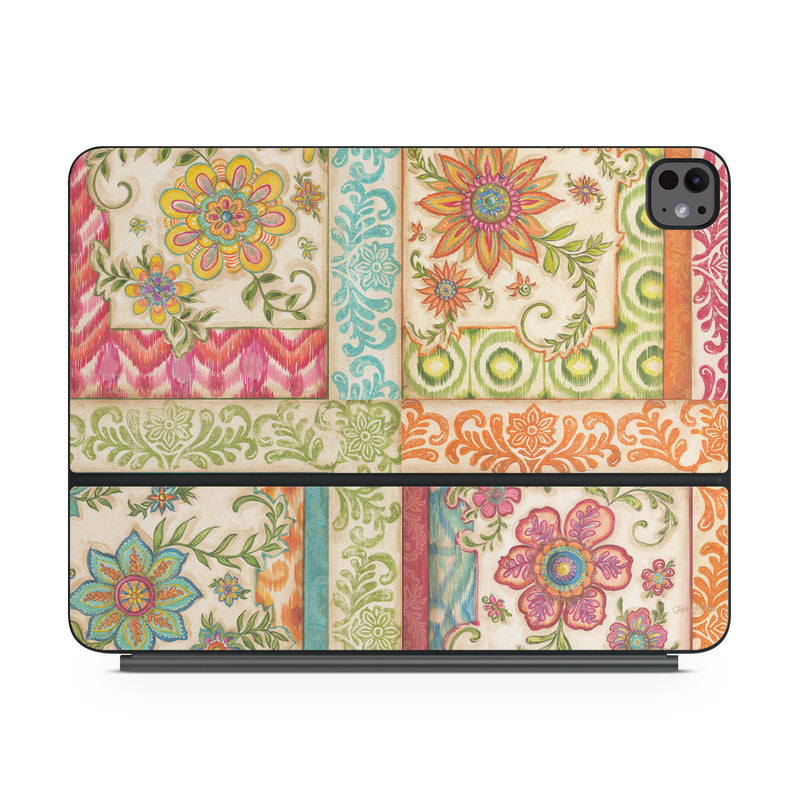 iStyles Magic Keyboard for iPad Series Skin design of Flower, Rectangle, Plant, Botany, Textile, Aqua, Art, Pattern, Symmetry, Motif, with red, orange, green, blue, pink, yellow colors, and tagged with fineart, patterns, flowers, flower, patterns, painting, drawing.