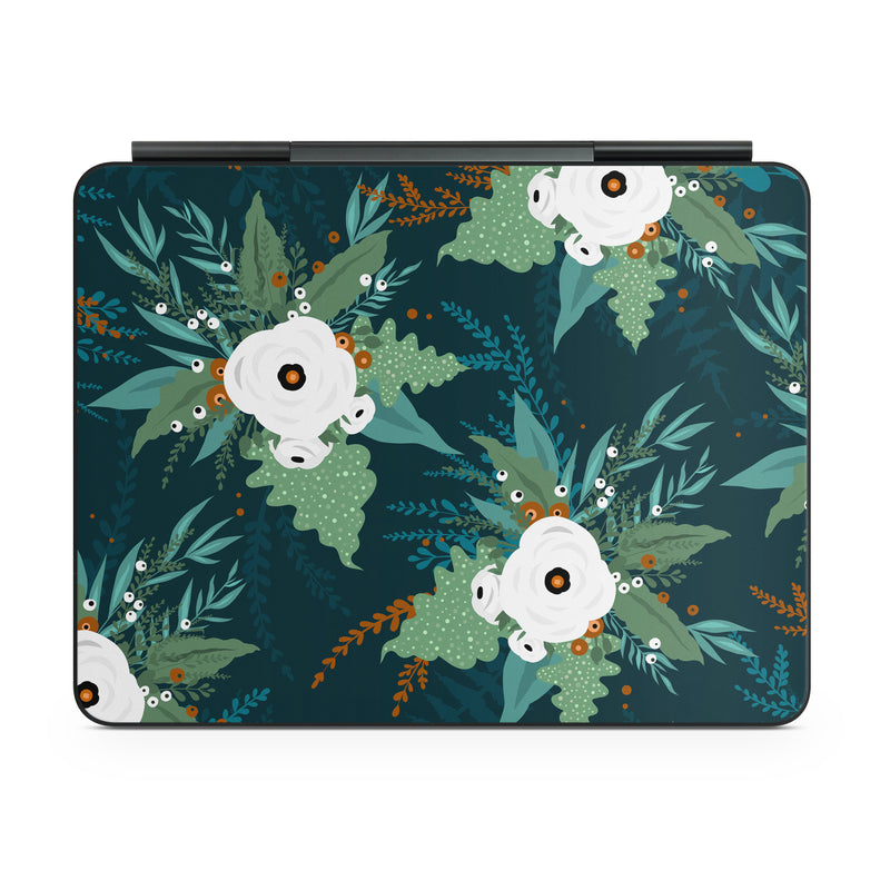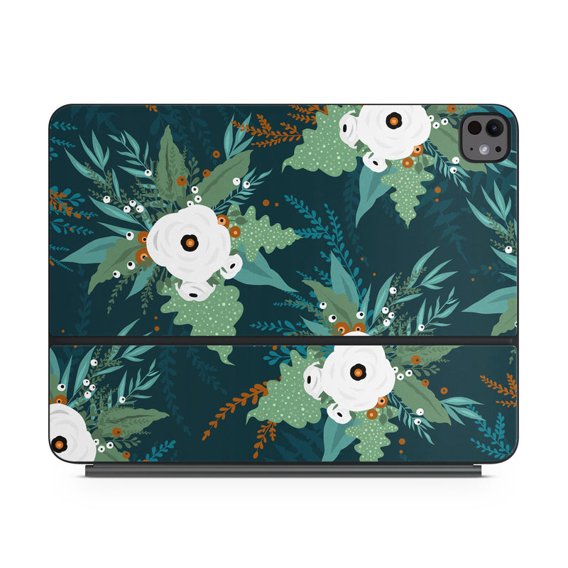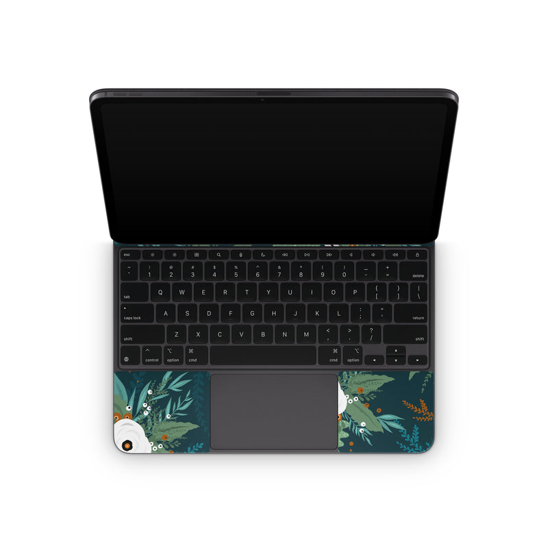 iStyles Magic Keyboard for iPad Series Skin design of Pattern, Branch, Tree, Illustration, Design, Plant, Textile, Art, Visual arts, Space, with green, white, red, blue colors, and tagged with patterns, flowers, blue, florals, flowers, garden, green, pattern.