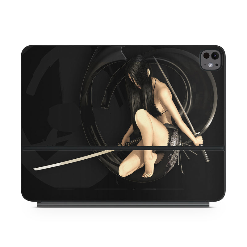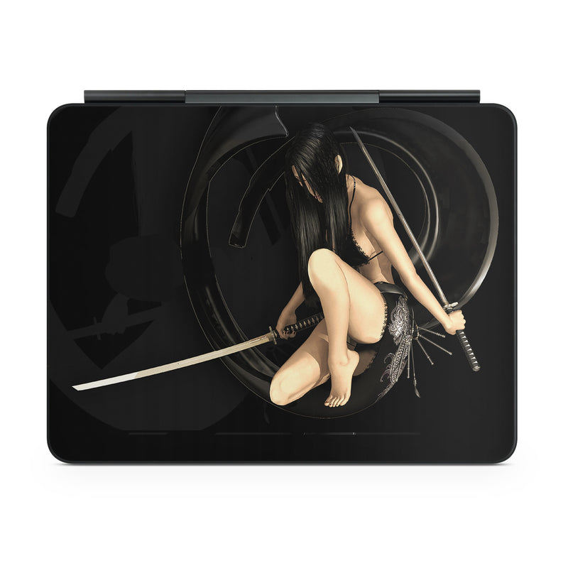 iStyles Magic Keyboard for iPad Series Skin design of Black, Photography, Leg, Black hair, Cg artwork, Darkness, Fetish model, Sitting, Flash photography, with black, yellow, gray, white colors, and tagged with fantasy, people, objects.