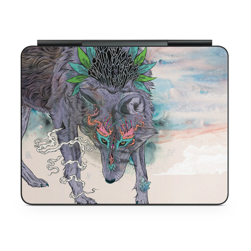 iStyles Magic Keyboard for iPad Series Skin design of Illustration, Boar, Art, Drawing, Fictional character, Sketch, Suidae, with gray, pink, black, blue, yellow colors, and tagged with animals, fantasy, crystals, feathers, gems, magical, space, spirit, tribal, wolf.