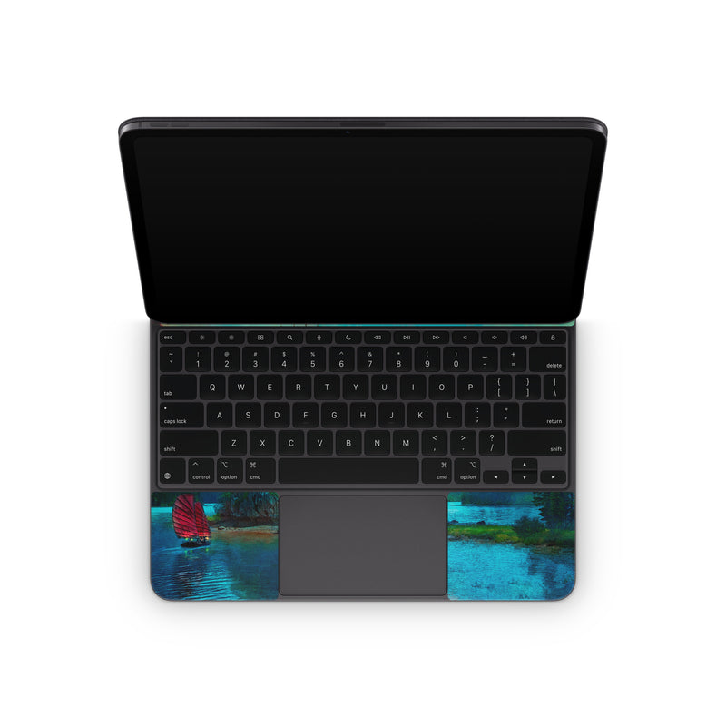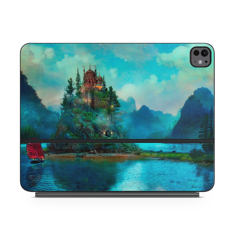 iStyles Magic Keyboard for iPad Series Skin design of Nature, Natural landscape, Sky, Painting, Landscape, Illustration, Watercolor paint, Art, Calm, Water castle, with black, gray, blue, green colors, and tagged with fineart, objects, fantasy, nature, urban.