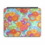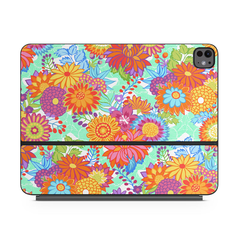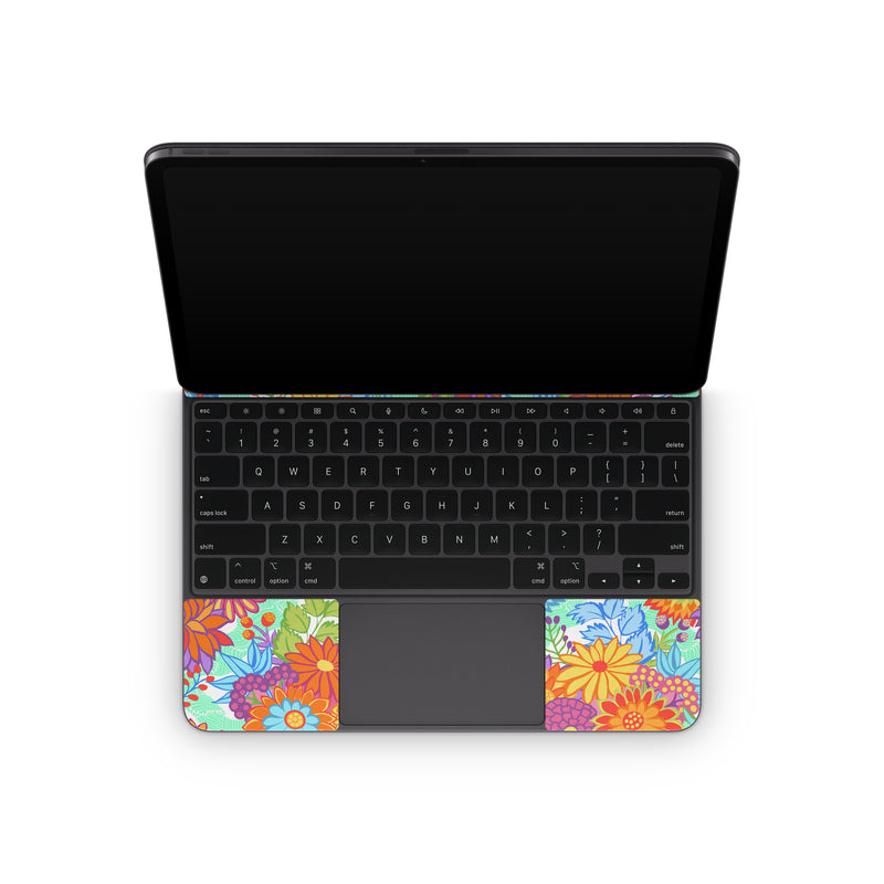 iStyles Magic Keyboard for iPad Series Skin design of Pattern, Floral design, Orange, Flower, Design, Textile, Plant, Wildflower, Wrapping paper, Visual arts, with gray, orange, green, purple colors, and tagged with patterns, flowers, bright, carnival, floral, flowers, fuchsia, green, orange, pattern, pink, yellow.