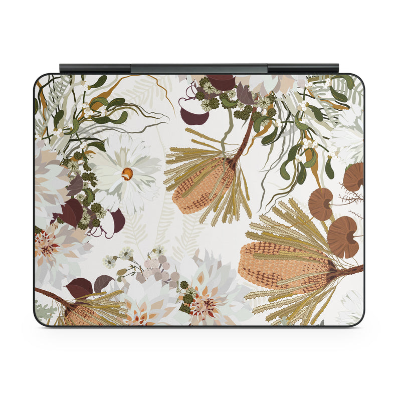iStyles Magic Keyboard for iPad Series Skin design of Flower, Botany, Plant, Floral design, Wildflower, Pattern, Wallpaper, Textile, Petal, Butterfly, with white, brown, green, gray colors, and tagged with nature, patterns, flowers, brown, cream, filigree, floral, flower, flowers, green, leaf, leaves, nature, neutral, outdoor.