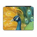iStyles Magic Keyboard for iPad Series Skin design of Bird, Peafowl, Phasianidae, Beak, Organism, Art paint, Galliformes, Art, Feather, Painting, with yellow, orange, green, blue, white, black colors, and tagged with fantasy, animals, patterns, peacock, peahen, peafowl, feathers.