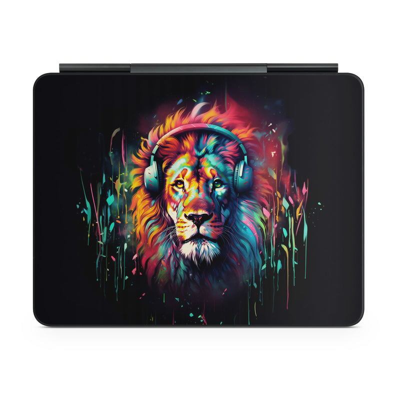 iStyles Magic Keyboard for iPad Series Skin design of Felidae, Siberian tiger, Bengal tiger, Carnivore, Big cats, Tiger, Painting, Art, Font, Paint, with black, red, yellow, orange, green, blue, pink colors, and tagged with animals, fantasy, objects, lion, headphones.