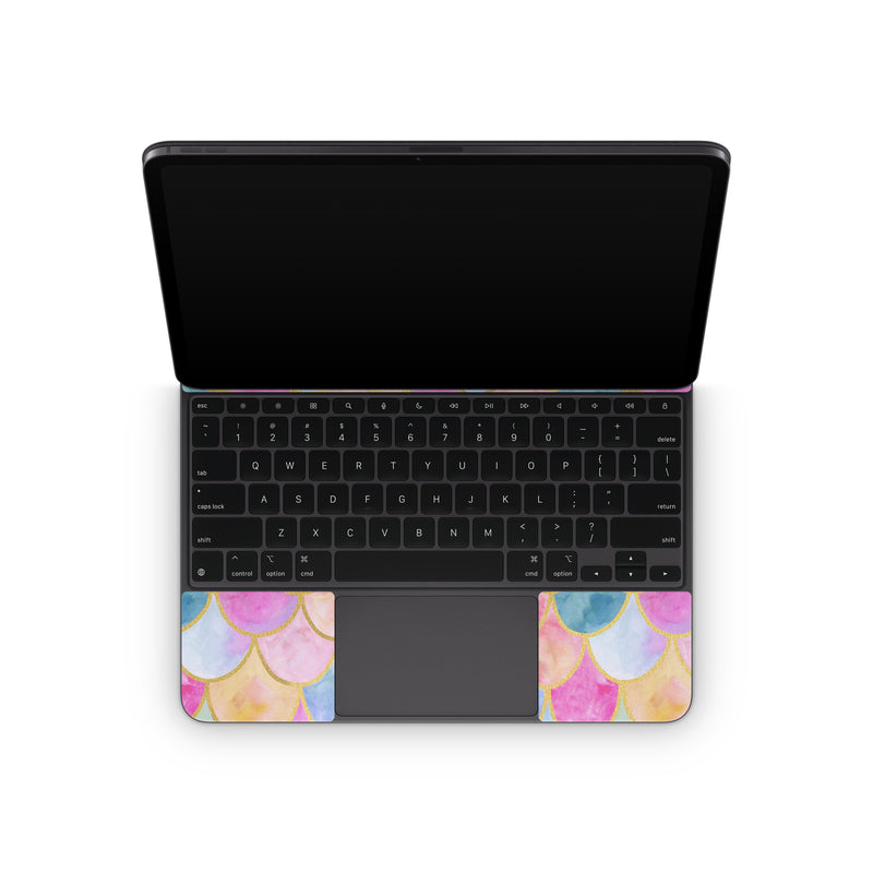 iStyles Magic Keyboard for iPad Series Skin design of Colorfulness, Natural material, Pink, Art, Line, Magenta, Red, Creative arts, Circle, Pattern, with pink, purple, blue, orange, yellow, white colors, and tagged with patterns, lookslike, mermaid, fish, colorful, fantasy.