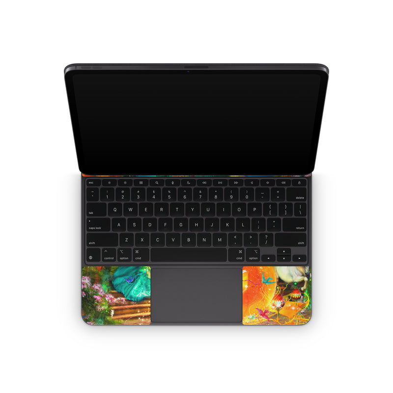 iStyles Magic Keyboard for iPad Series Skin design of Mythology, Adventure game, World, Fictional character, Theatrical scenery, Art, with yellow, orange, blue, green, red, purple, white, black colors, and tagged with fantasy, animals, objects, urban.