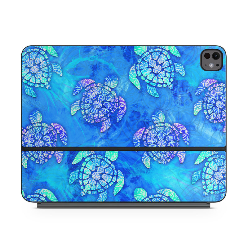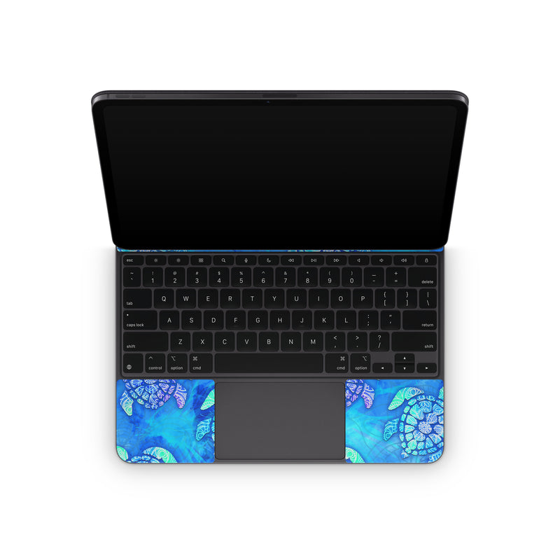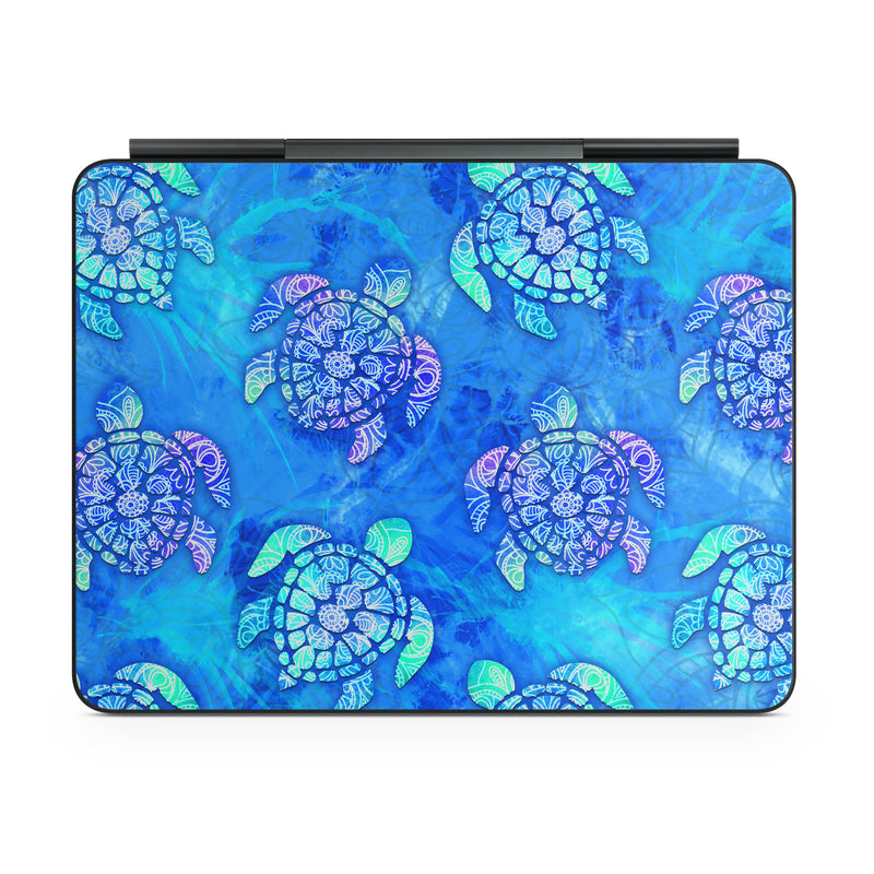 iStyles Magic Keyboard for iPad Series Skin design of Blue, Pattern, Organism, Design, Sea turtle, Plant, Electric blue, Hydrangea, Flower, Symmetry, with blue, green, purple colors, and tagged with patterns, animals, flower, nature, sealife, turtle, turtles, watercolor.