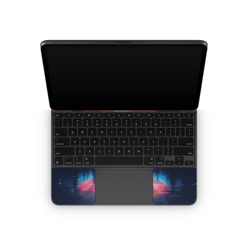 iStyles Magic Keyboard for iPad Series Skin design of Water, Sky, Cloud, Daytime, World, Mountain, Natural Landscape, Azure, Paint, Plant, Tree, with black, blue, red, yellow, orange, pink, purple colors, and tagged with nature, space, mountains, landscape, moon, clouds, lake, reflection.