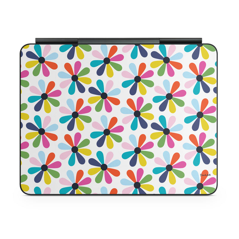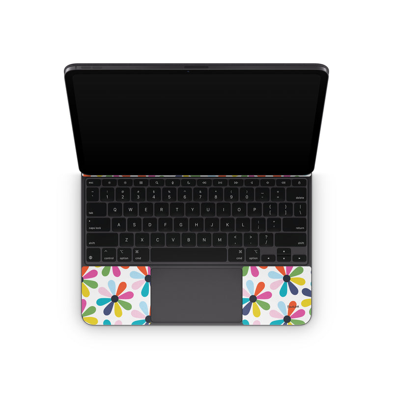 iStyles Magic Keyboard for iPad Series Skin design of Colorfulness, Aqua, Symmetry, Pattern, Electric blue, Art, Circle, Visual arts, Tints and shades, Wrapping paper, with white, red, blue, pink, purple, green colors, and tagged with patterns, flowers, dainty, daisy, delicate, floral, flower, flowers, garden, multi, multicolor, pattern, rainbow.