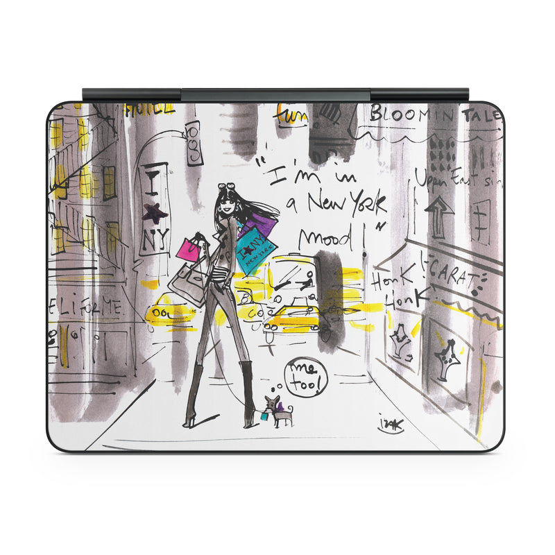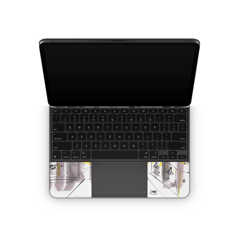 iStyles Magic Keyboard for iPad Series Skin design of Drawing, Sketch, Fictional character, Graphic design, Illustration, Art, with gray, white, black, red, green colors, and tagged with people, urban, objects, animals, signs.