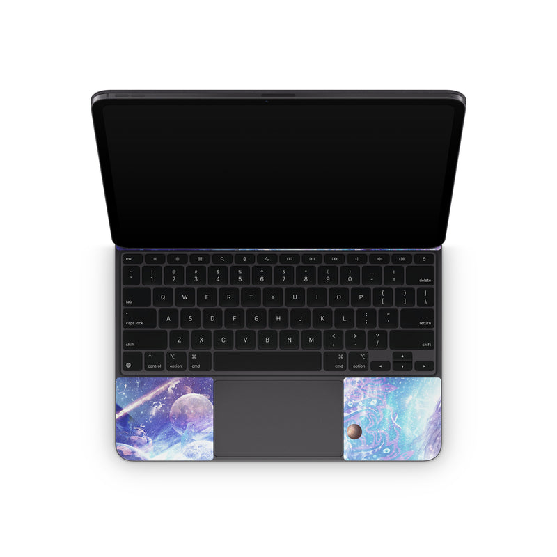 iStyles Magic Keyboard for iPad Series Skin design of Bird, Butterfly, Planets, Deer, Space, Purple, World, Astronomical Object, Cg Artwork, Illustration, Universe, Painting, Fictional Character, Outer Space, Astronomy, Science, Water Feature, Graphic Design, Graphics, Star, Mythology, with blue, purple, white, black, gray, green colors, and tagged with space, fantasy, animals, nature, urban, people, objects, flowers, fantasy, landscape, nature, sci-fi, tree, trees.
