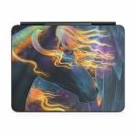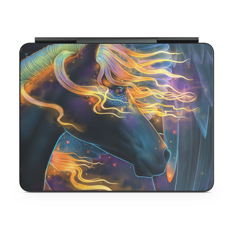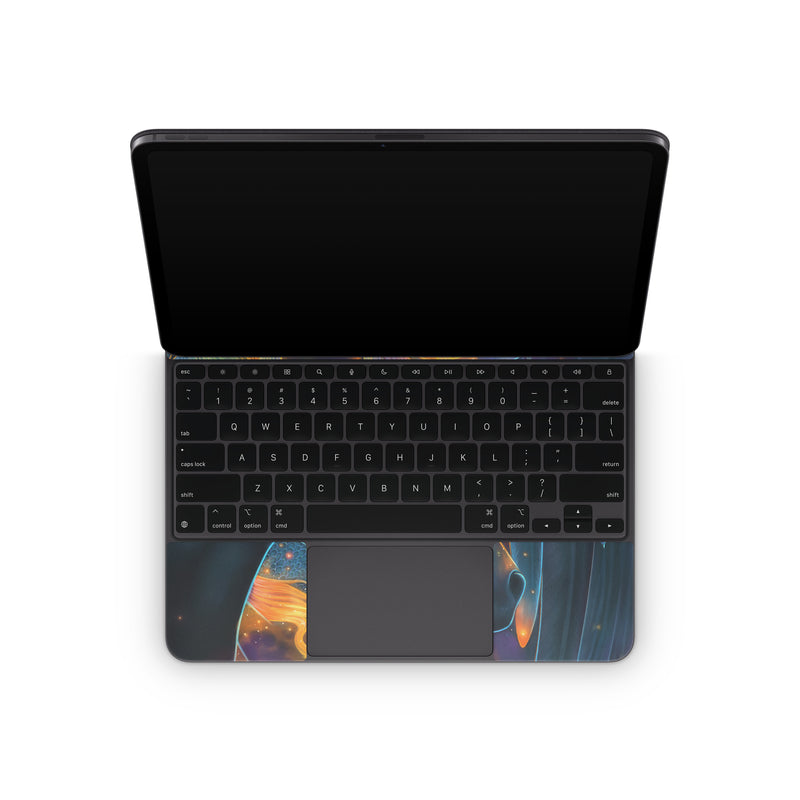 iStyles Magic Keyboard for iPad Series Skin design of Organism, Astronomical object, Art, Electric blue, Space, Darkness, Liquid, Science, Graphics, Visual arts, with black, blue, yellow, white, orange, purple, red colors, and tagged with fantasy, animals, space, flames, horse, stars, constellations, sun.